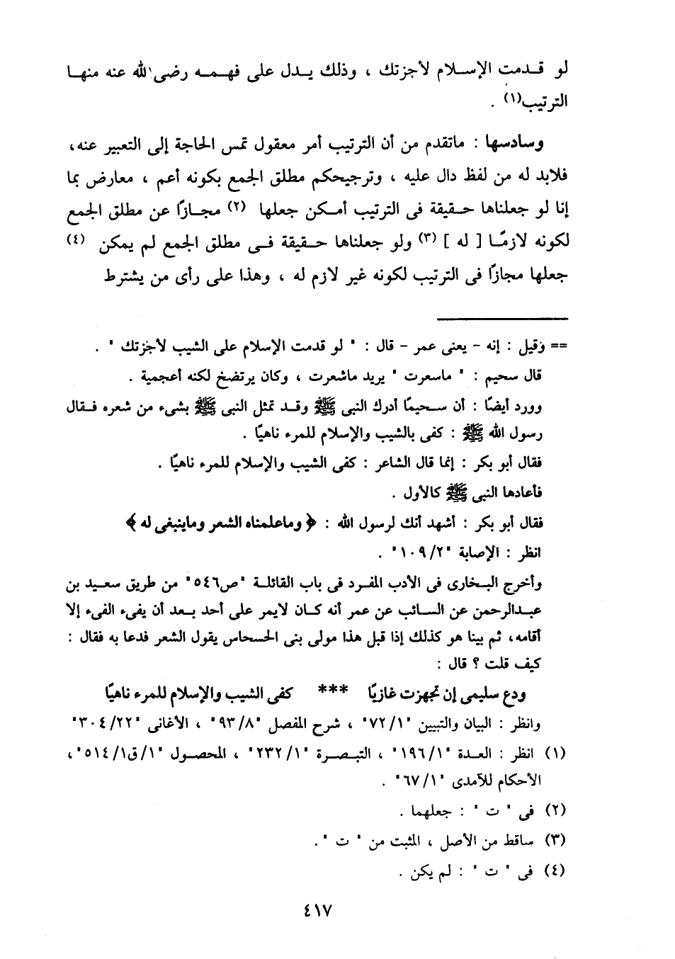 لو قدمت الإسلام لأجزتك، وذلك يدل على فهمه رضي الله عنه منها الترتيب.
