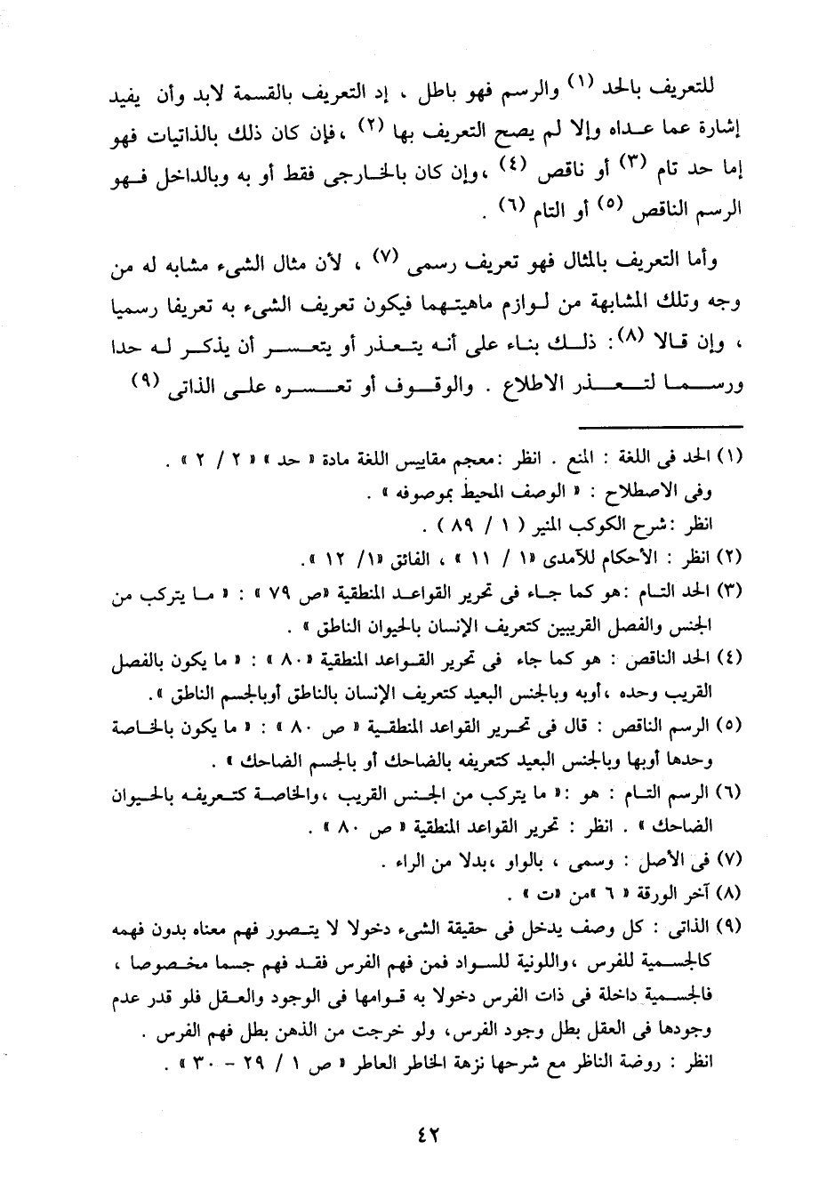 وأما التعريف بالمثال فهو تعريف رسمي، لأن مثال الشيء مشابه له من وجه وتلك المشابهة من لوازم ماهيتهما فيكون تعريف الشيء به تعريفا رسميا، وإن قالا: ذلك بناء على أنه يتعذر أو يتعسر أن يذكر له حدا ورسما لتعذر الاطلاع. والوقوف أو تعسره على الذاتي