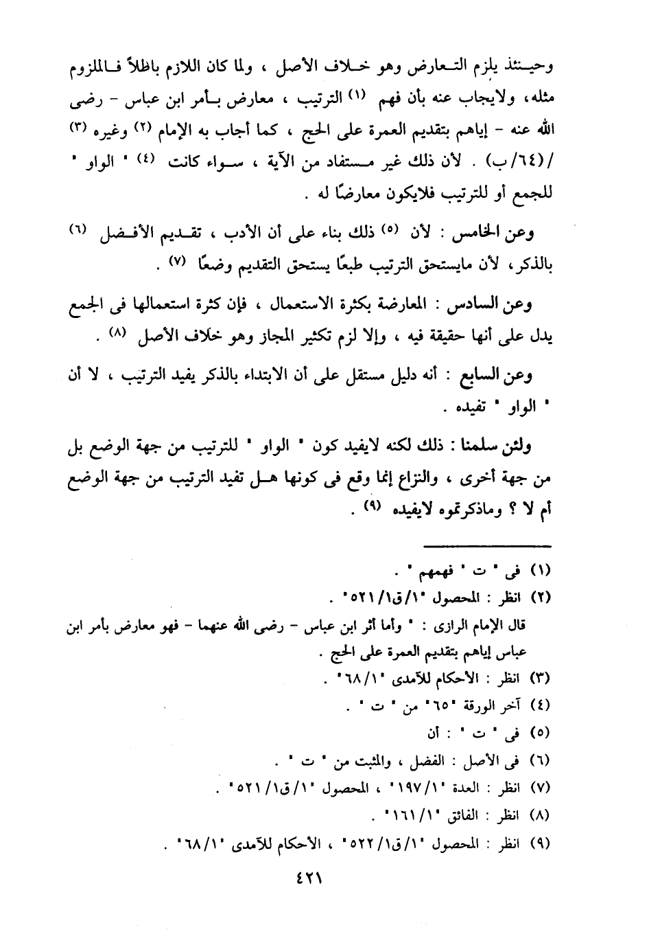 وحينئذ يلزم التعارض وهو خلاف الأصل، ولما كان اللازم باطلا فالملزوم مثله، ولا يجاب عنه بأن فهم الترتيب، معارض بأمر ابن عباس- رضي الله عنه- إياهم بتقديم العمرة على الحج، كما أجاب به الإمام وغيره/ (64/ب). لأن ذلك غير مستفاد من الآية، سواء كانت "الواو" للجمع أو للترتيب فلا يكون معارضا له.