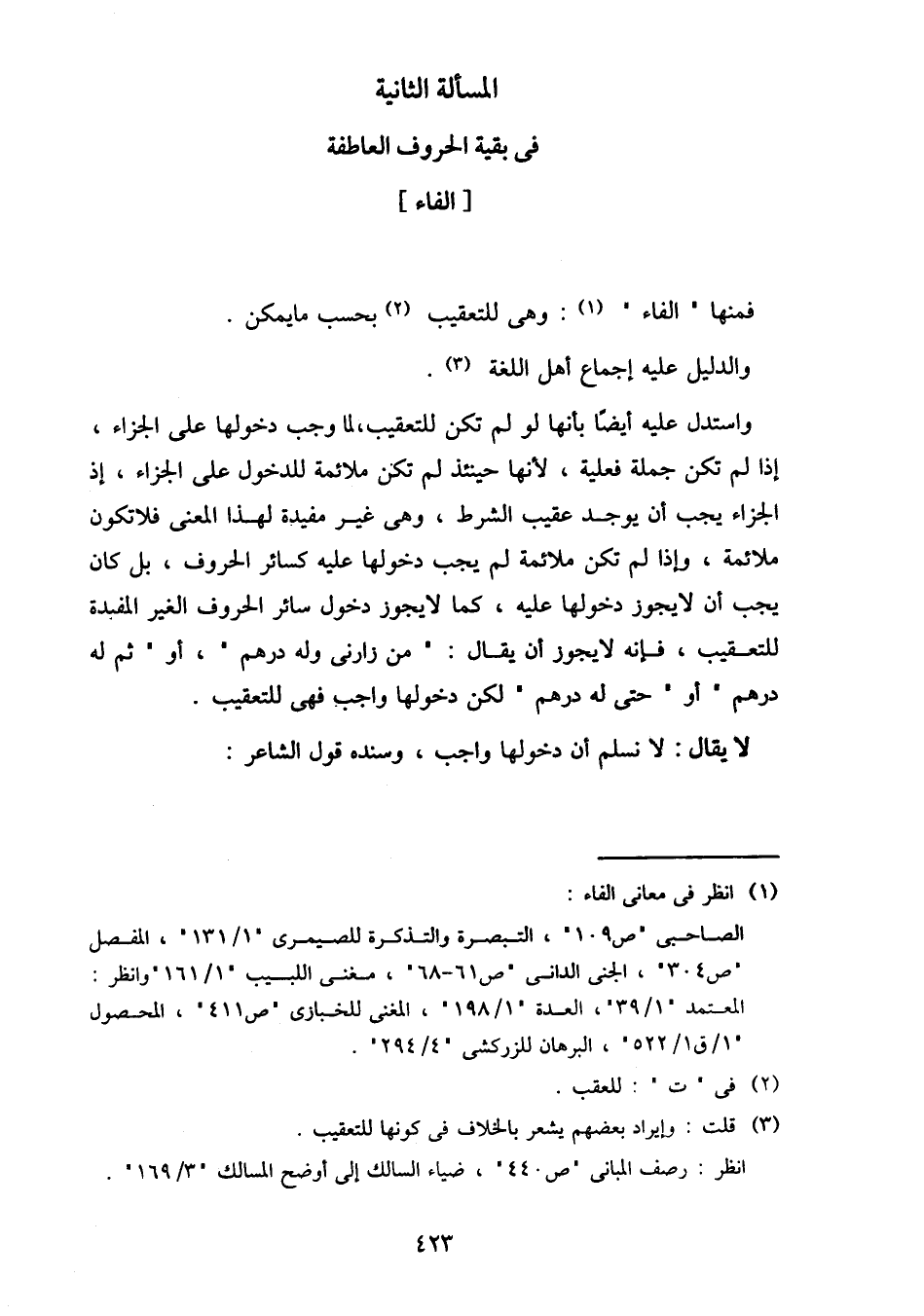 واستدل عليه أيضا بأنها لو لم تكن للتعقيب، لما وجب دخلوها على الجزاء، إذا لم تكن جملة فعلية، لأنها حينئذ لم تكن ملائمة للدخول على الجزاء، إذ الجزاء يجب أن يوجد عقيب الشرط، وهي غير مفيدة لهذا المعنى فلا تكون ملائمة، وإذا لم تكن ملائمة لم يجب دخولها عليه كسائر الحروف، بل كان يجب أن لا يجوز دخولها عليه، كما لا يجوز دخول سائر الحروف الغير المفيدة للتعقيب، فإنه لا يجوز أن يقال: "من زارني وله درهم"، أو "ثم له درهم" أو "حتى له درهم" لكن دخولها واجب فهي للتعقيب.
