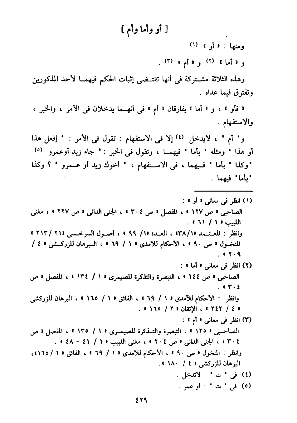 و"أم"، لا يدخل إلا في الاستفهام: تقول في الأمر: "إفعل هذا أو هذا" ومثله "بأما" فيهما، وتقول في الخبر: "جاء زيد أو عمر" وكذا "بأما فيهما، في الاستفهام، "أخوك زيد أو عمرو"؟ وكذا "بأما" فيهما.