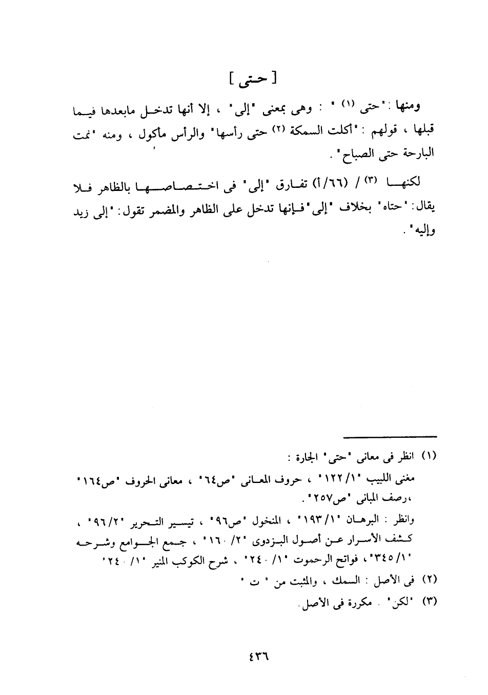 ومنها: "حتى": وهي بمعنى "إلى"، إلا أنها تدخل ما بعدها فيما قبلها، قولهم: "أكلت السمكة حتى رأسها" والرأس مأكول، ومنه "نمت البارحة حتى الصباح".