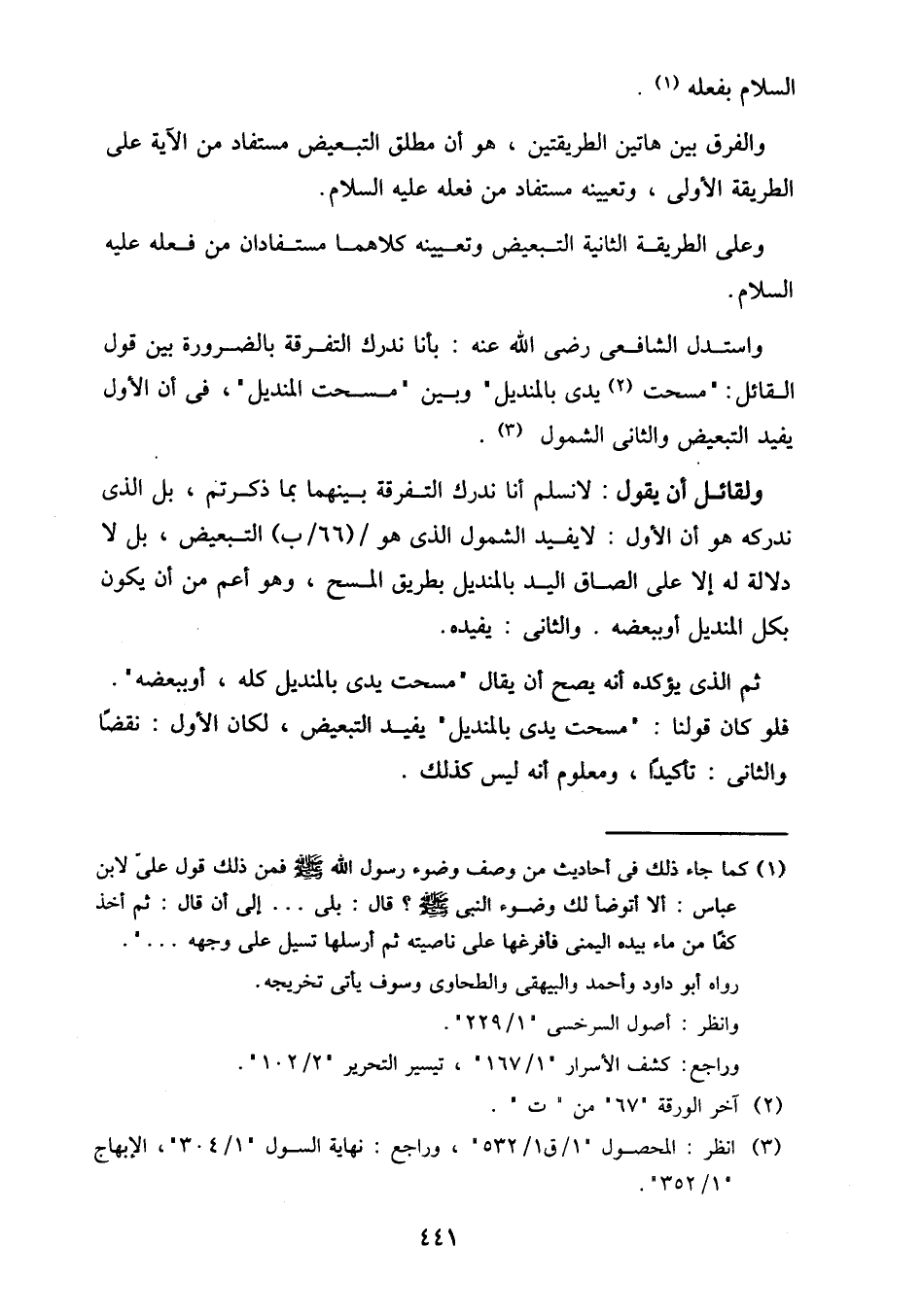 قول كان قولنا: "مسحت يدي بالمنديل" يفيد التبعيض، لكان الأول: نقضا والثاني: تأكيدا، ومعلوم أنه ليس كذلك.