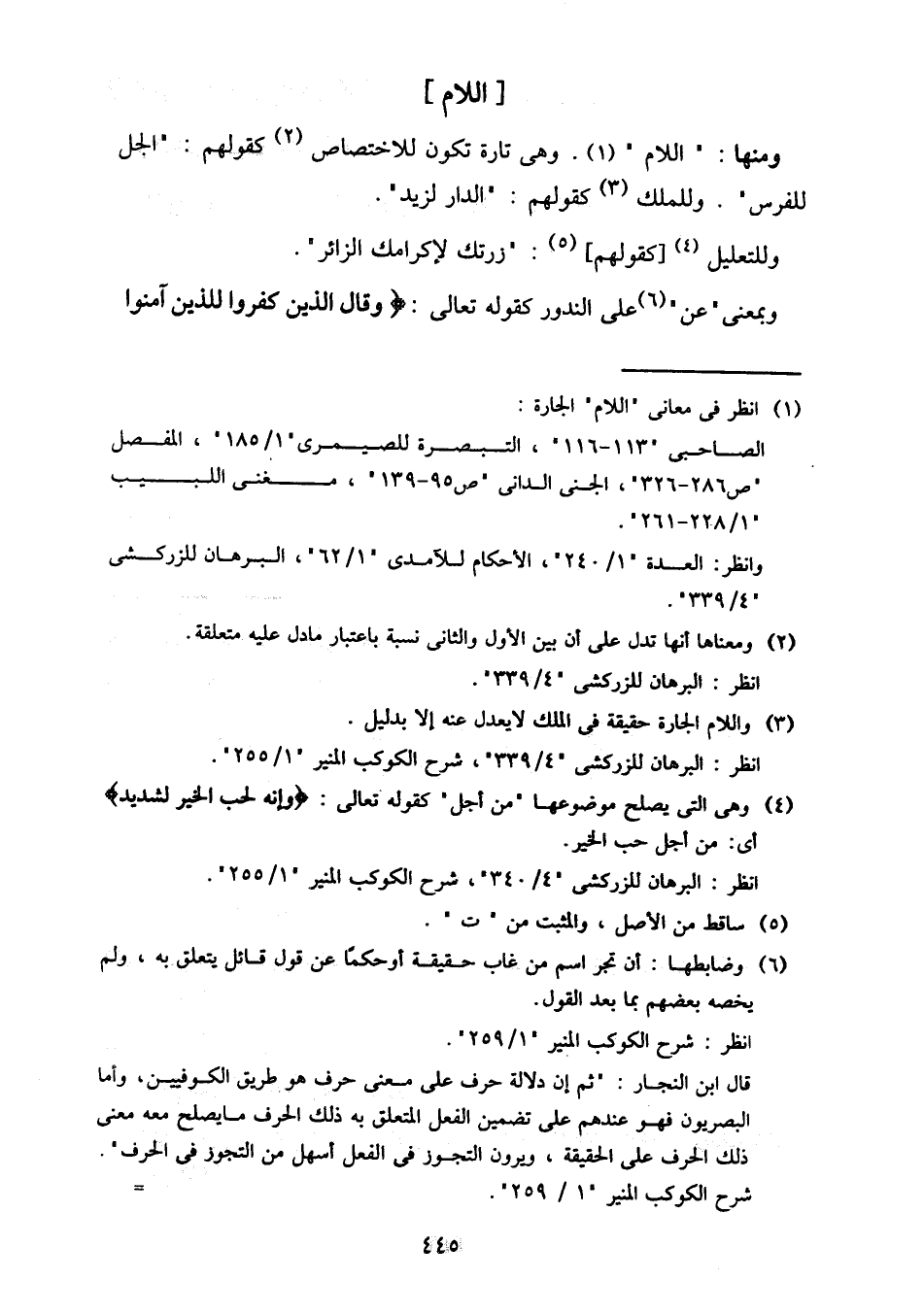 ومنها: "اللام". وهي تارة تكون للاختصاص كقولهم: "الجل للفرس". وللملك كقولهم: "الدار لزيد".
