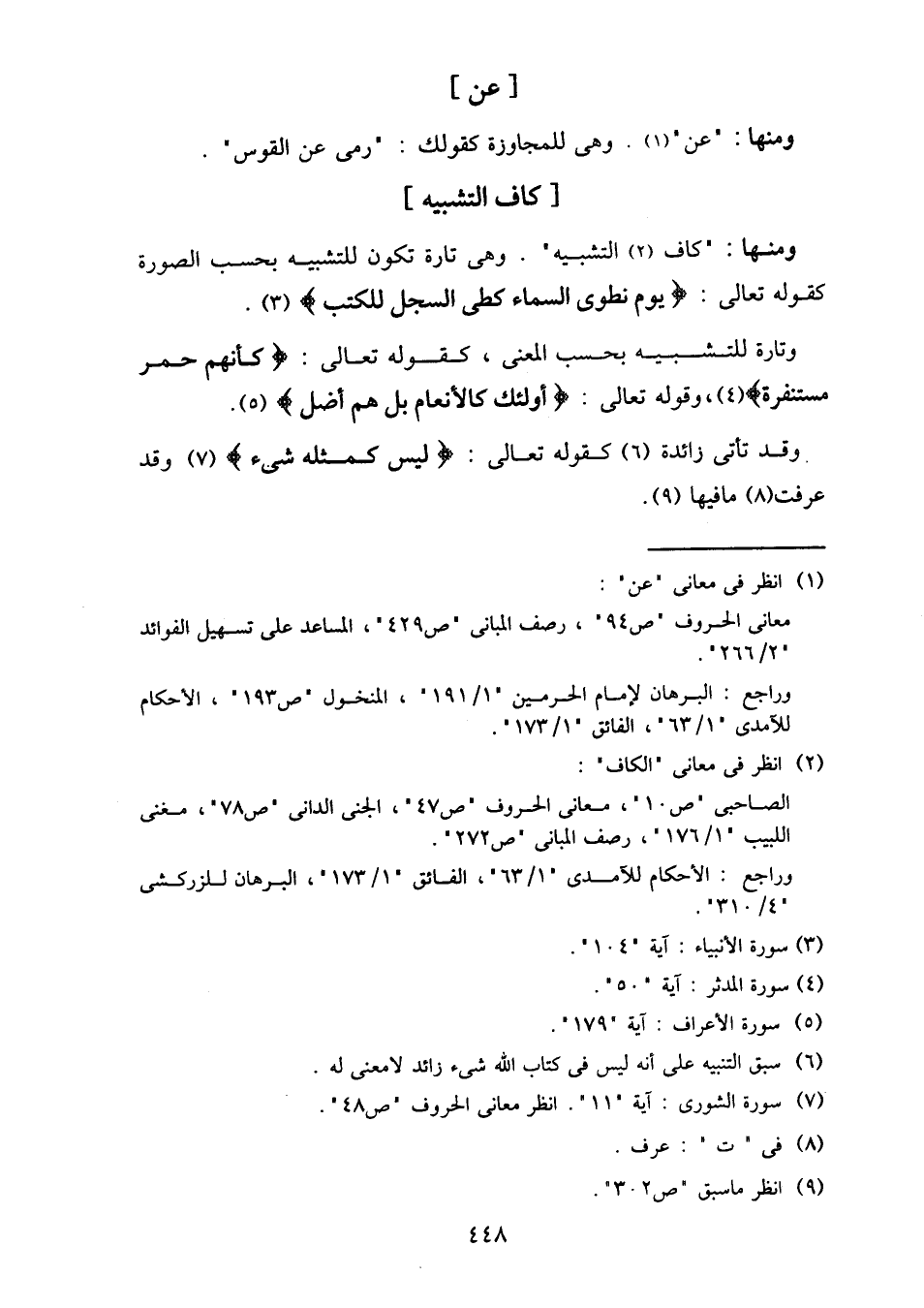 ومنها: "كاف التشبيه". وهي تارة تكون للتشبيه بحسب الصورة كقوله تعالى: {يوم نطوى الماء كطي السجل للكتب}.