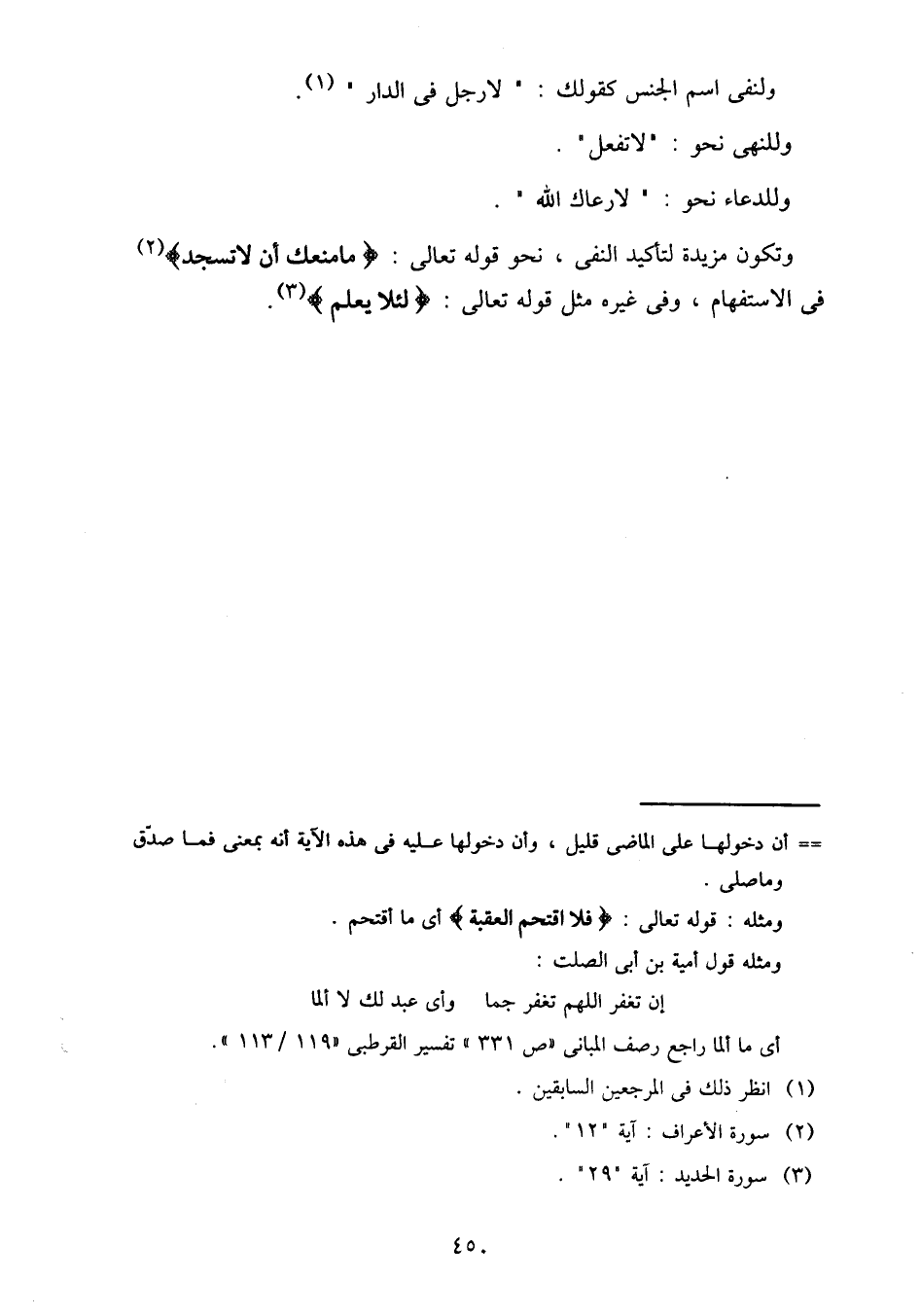 وتكون مزيدة لتأكيد النفي، نحو قوله تعالى: {ما منعك أن لا تسجد} في الاستفهام، وفي غيره مثل قوله تعالى: {لئلا يعلم}.