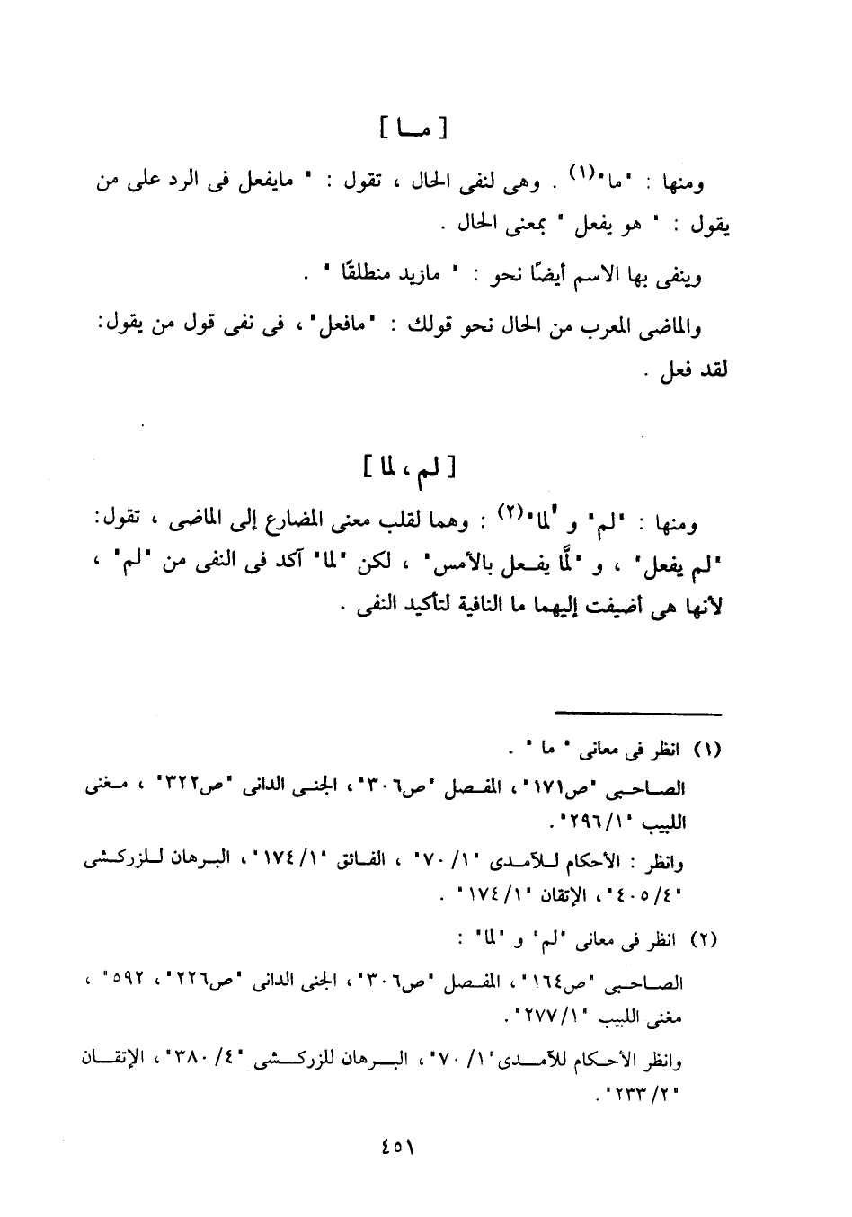 ومنها: "لم" و "لما": وهما لقلب معنى المضارع إلى الماضي، تقول: "لم يفعل"، و "لما يفعل بالأمس"، لكن "لما" آكد في النفي من "لم"، لأنها هي أضيفت إليهما ما النافية لتأكيد النفي.