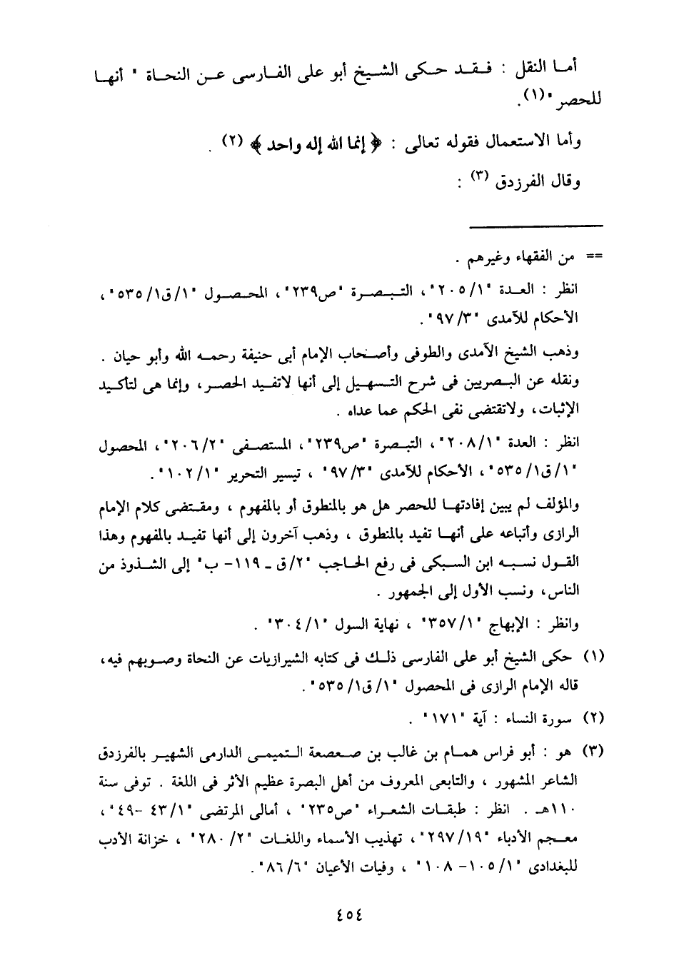 أما النقل: فقد حكى الشيخ أبو علي الفارسي عن النحاة "أنها للحصر".