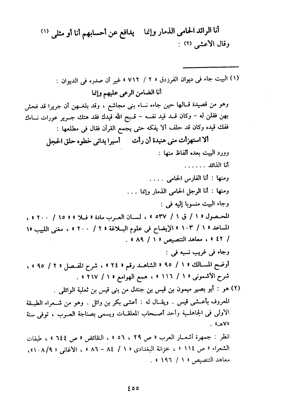 أنا الرائد الحامي الذمار وإنما يدافع عن أحسابهم أنا أو مثلي وقال الأعشى: