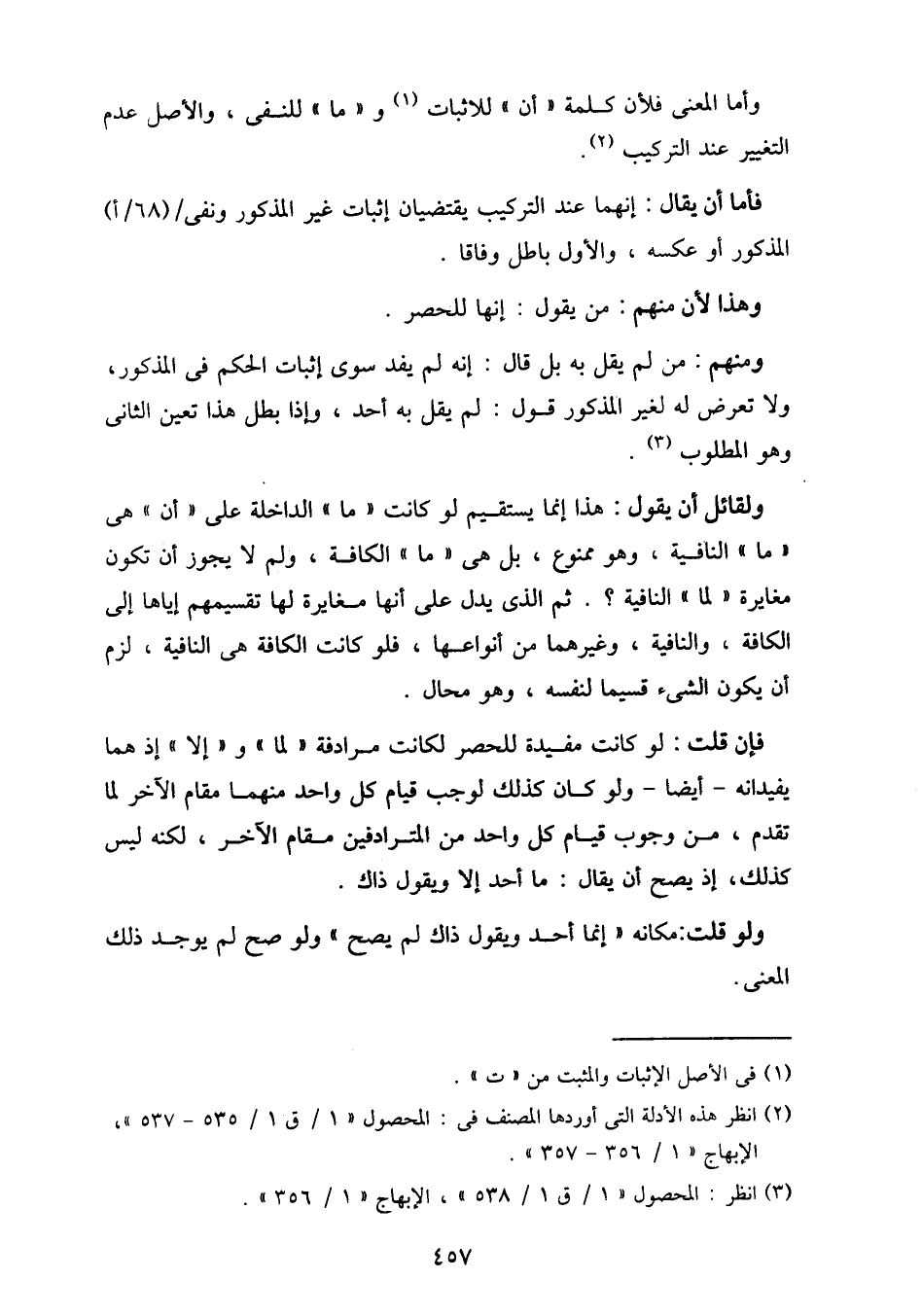 ولقائل أن يقول: هذا إنما يستقيم لو كانت "ما" الداخلة على "أن" هي "ما" النافية، وهو ممنوع، بل هي "ما" الكافة، ولم لا يجوز أن تكون مغايرة "لما" النافية؟. ثم الذي يدل على أنها مغايرة لها تقسيمهم إياها إلى الكافة، والنافية، وغيرهما من أنواعها، فلو كانت الكافة هي النافية، لزم أن يكون الشيء قسيما لنفسه، وهو محال.