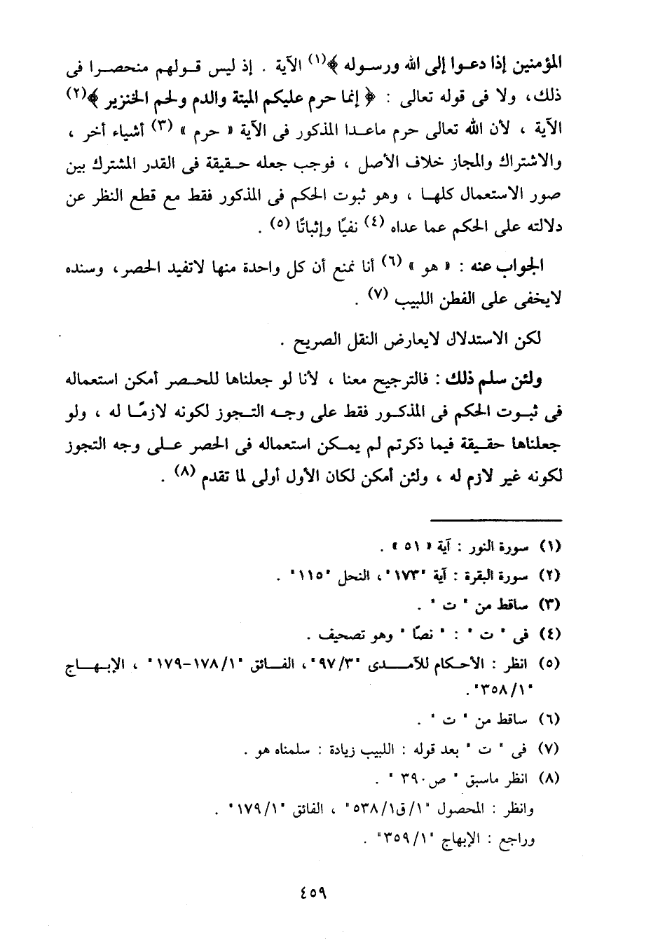 المؤمنين إذا دعوا إلى الله ورسوله} الآية. إذ ليس قولهم منحصرا في ذلك، ولا في قوله تعالى: {إنما حرم عليكم الميتة والدم ولحم الخنزير} الآية، لأن الله تعالى حرم ماعدا المذكور في الآية "حرم" أشياء أخر، والاشتراك والمجاز خلاف الأصل، فوجب جعله حقيقة في القدر المشترك بين صور الاستعمال كلها، وهو ثبوت الحكم في المذكور فقط مع قطع النظر عن دلالته على الحكم عما عداه نفيا وإثباتا.
