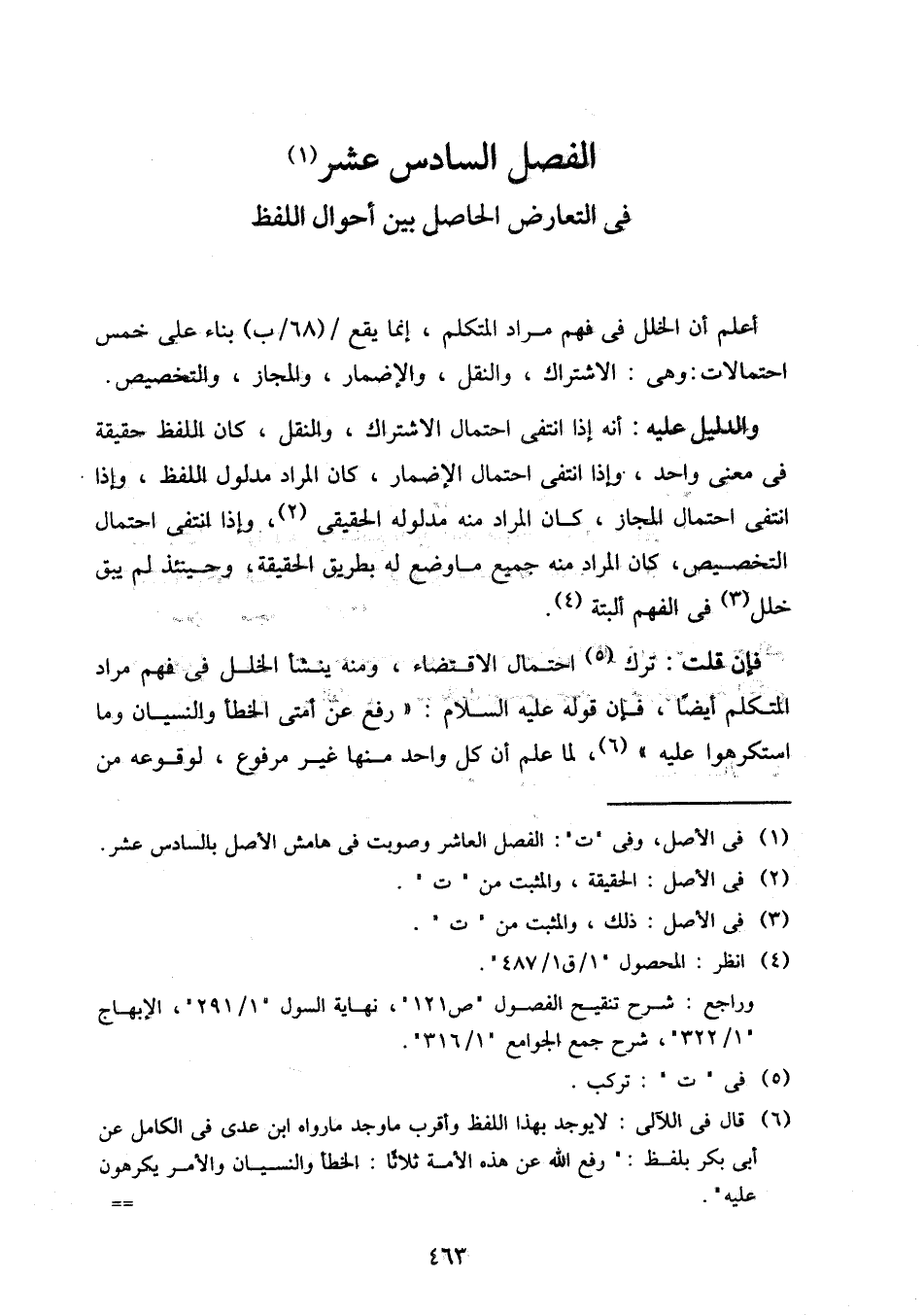 وأعلم أن الخلل في فهم مراد المتكلم، إنما يقع/ (68/ب) بناء على خمس احتمالات: وهي: الاشتراك، والنقل، والإضمار، والمجاز، والتخصيص.