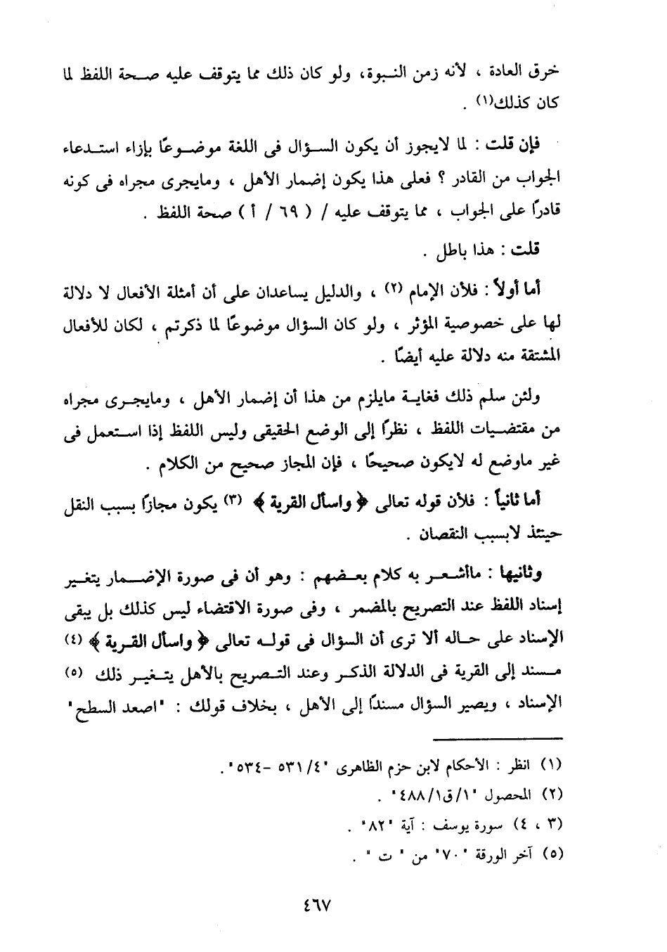 ولئن سلم ذلك فغاية ما يلزم من هذا أن إضمار الأهل، وما يجرى مجراه من مقتضيات اللفظ، نظرا إلى الوضع الحقيقي وليس اللفظ إذا استعمل في غير ما وضع له لا يكون صحيحا، فإن المجاز صحيح من الكلام.