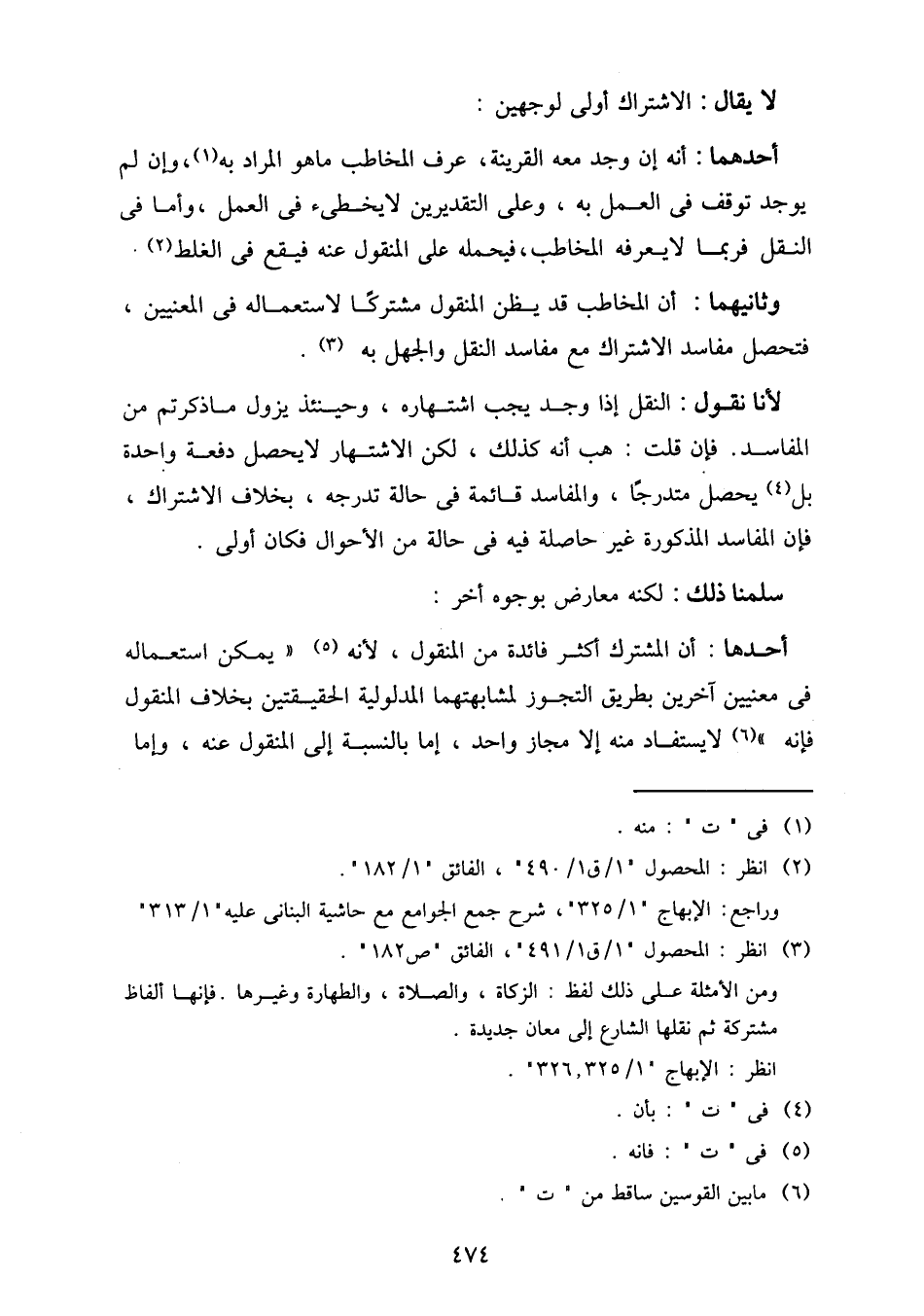 أحدها: أن المشترك أكثر فائدة من المنقول، لأنه "يمكن استعماله في معنيين آخرين بطريق التجوز لمشابهتهما المدلولية الحقيقتين بخلاف المنقول فإنه" لا يستفاد منه إلا مجاز واحد، إما بالنسبة إلى المنقول عنه، وأما