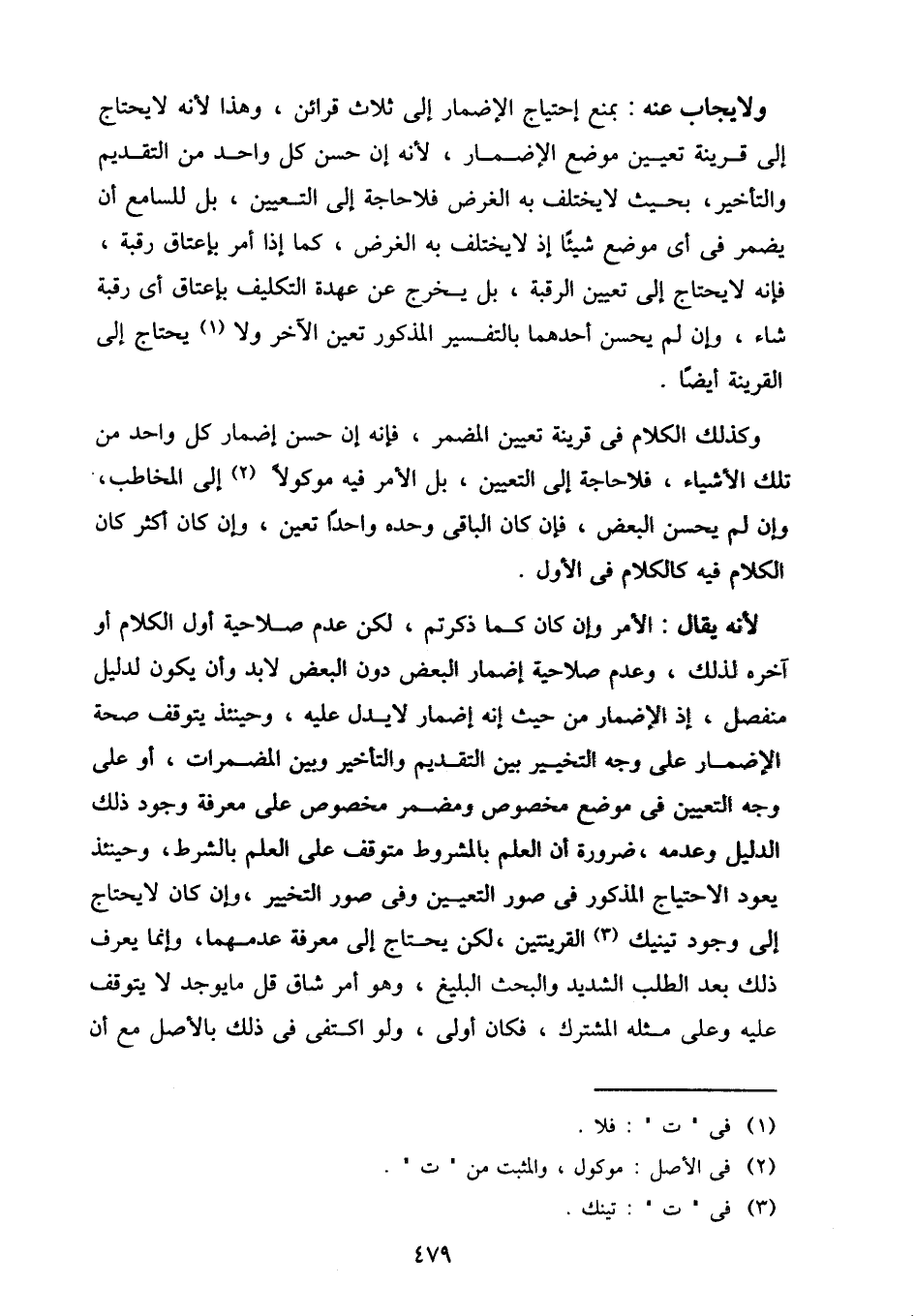 ولا يجاب عنه: بمنع إحتياج الإضمار إلى ثلاث قرائن، وهذا لأنه لا يحتاج إلى قرينة تعيين موضع الإضمار، لأنه إن حسن كل واحد من التقديم والتأخير، بحيث لا يختلف به الغرض فلا حاجة إلى التعيين، بل للسامع أن يضمر في أي موضع شيئا إذ لا يختلف به الغرض، كما إذا أمر بإعتاق رقبة، فإنه لا يحتاج إلى تعيين الرقبة، بل يخرج عن عهدة التكليف بإعتاق أي رقبة شاء، وإن لم يحسن بالتفسير المذكور تعين الآخر ولا يحتاج إلى القرينة أيضا.