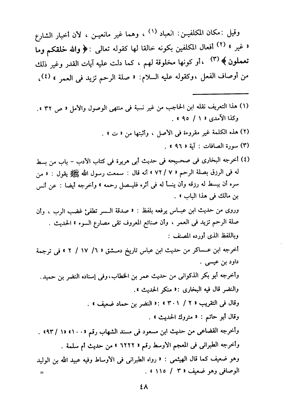 وقيل: مكان المكلفين: العباد، وهما غير مانعين، لأن أخبار الشارع "غير" أفعال المكلفين بكونه خالقا لها كقوله تعالى: {والله خلقكم وما تعملون}، أو كونها مخلوقة لهم، كما دلت عليه آيات القدر وغير ذلك من أوصاف الفعل، وكقوله عليه السلام: "صلة الرحم تزيد في العمر"،