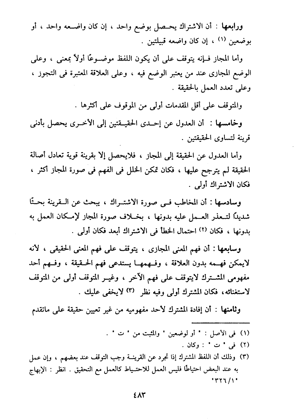 وسادسها: أن المخاطب في صورة الاشتراك، يبحث عن القرينة بحثا شديدا لتعذر العمل عليه بدونها، بخلاف صورة المجاز لإمكان العمل به بدونها، فكان احتمال الخطأ في الاشتراك أبعد فكان أولى.