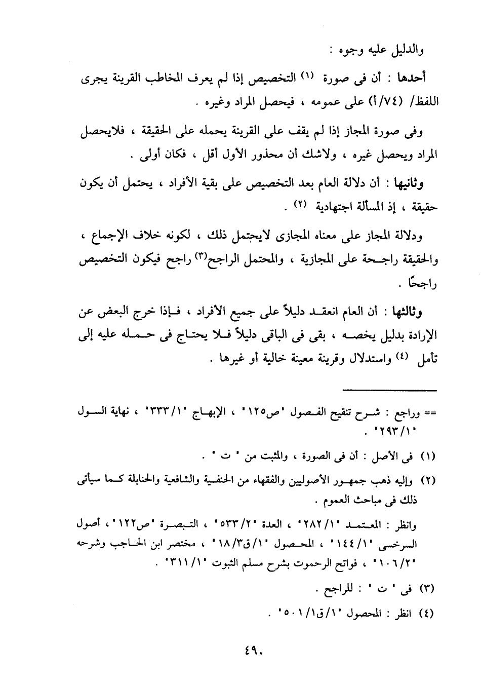 وثالثها: أن العام انعقد دليلا على جميع الأفراد، فإذا خرج البعض عن الإرادة بدليل يخصه، بقى في الباقي دليلا فلا يحتاج في حمله عليه إلى تأمل واستدلال وقرينة معينة خالية أو غيرها.