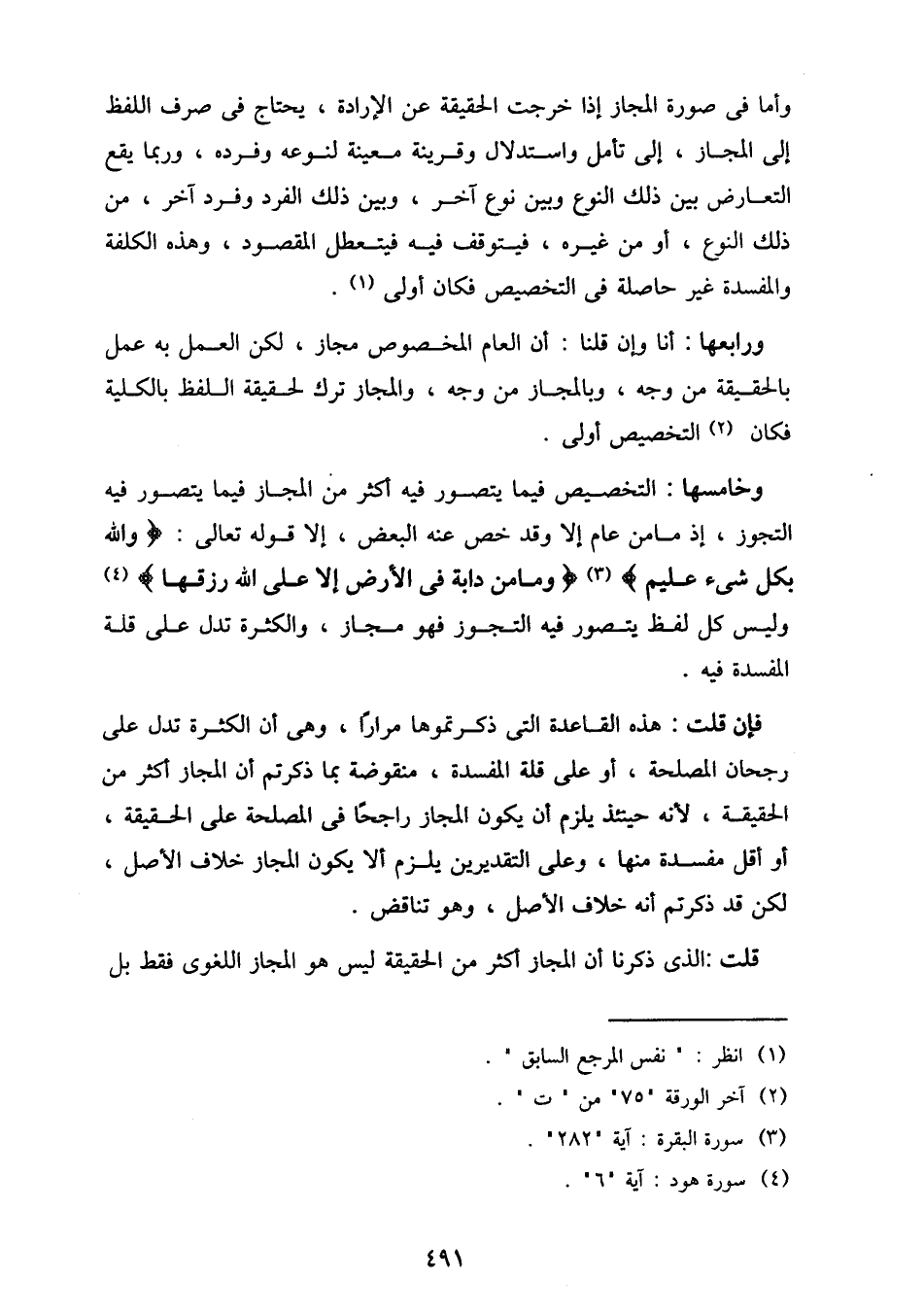 وخامسها: التخصيص فيما يتصور فيه أكثر من المجاز فيما يتصور فيه التجوز، إذ ما من عام إلا وقد خص عنه البعض، إلا قوله تعالى: {والله بكل شيء عليم} {وما من دابة في الأرض إلا على الله رزقها} وليس كل لفظ يتصور فيه التجوز فهو مجاز، والكثرة تدل على قلة المفسدة فيه.