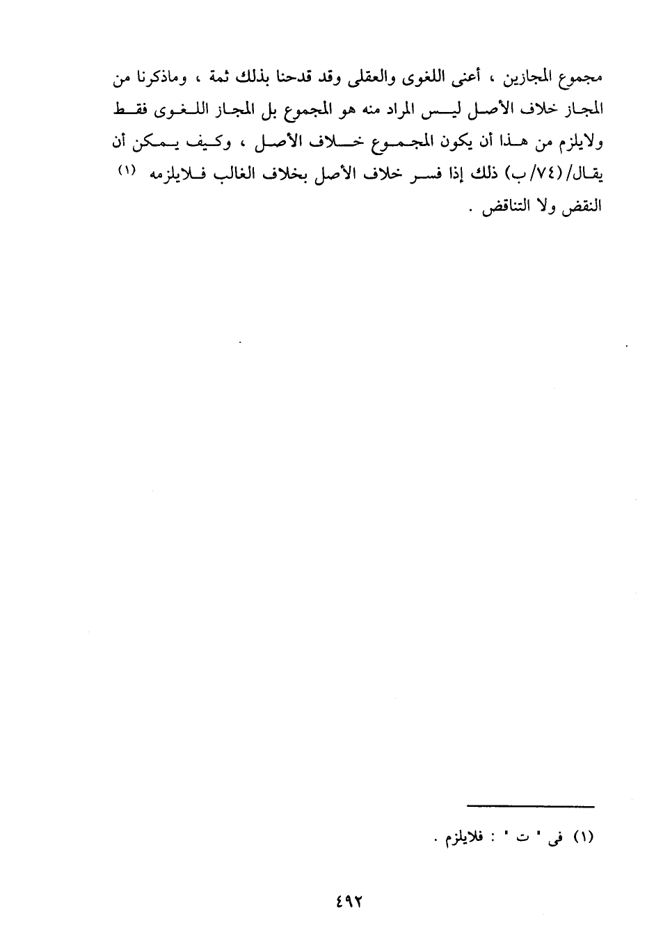 مجموع المجازين، أعني اللغوي والعقلي وقد قدحنا بذلك ثمة، وما ذكرنا من المجاز خلاف الأصل ليس المراد منه هو المجموع بل المجاز اللغوي فقط ولا يلزم من هذا أن يكون المجموع خلاف الأصل، وكيف يمكن أن يقال/ (74/ب) ذلك إذا فسر خلاف الأصل بخلاف الغالب فلا يلزمه النقض ولا التناقض.