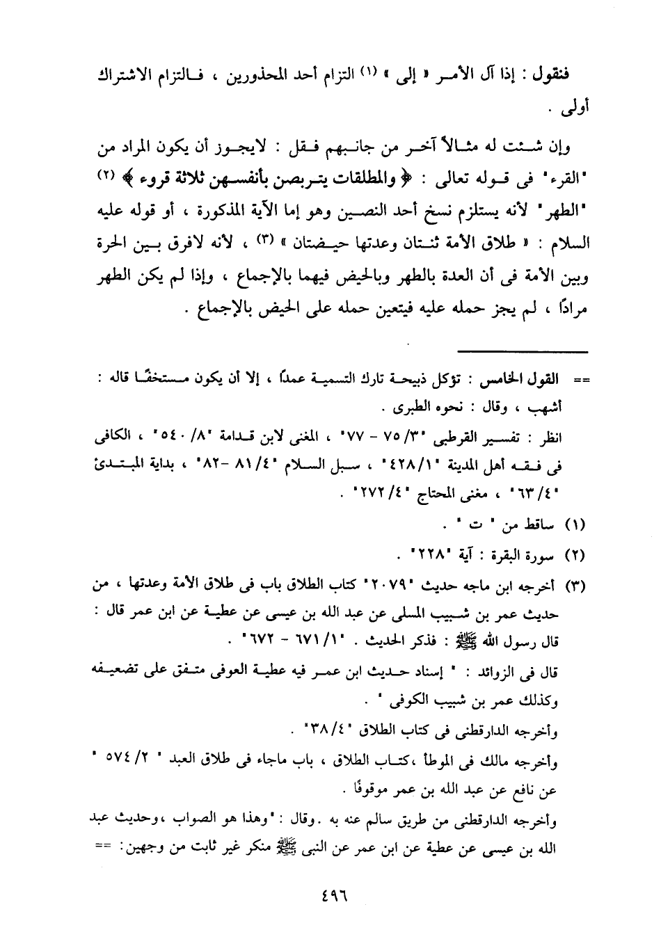 وإن شئت له مثالا آخر من جانبهم فقل: لا يجوز أن يكون المراد من "القرء" في قوله تعالى: {والمطلقات يتربصن بأنفسهن ثلاثة قروء} "الطهر" لأنه يستلزم نسخ احد النصين وهو إما الآية المذكورة، أو قوله عليه السلام: "طلاق الأمة ثنتان وعدتها حيضتان"، لأنه لا فرق بين الحرة وبين الأمة في أن العدة بالطهر وبالحيض فيهما بالإجماع، وإذا لم يكن الطهر مرادا، لم يجز حمله عليه فيتعين حمله على الحيض بالإجماع.