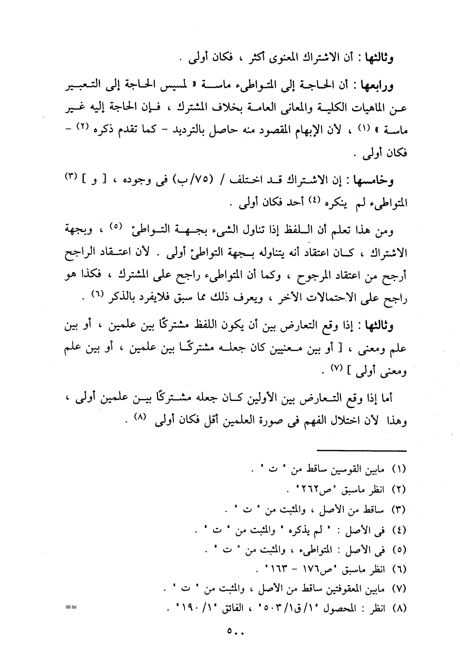 ورابعها: أن الحاجة إلى المتواطئ ماسة "لمسيس الحاجة إلى التعبير عن الماهيات الكلية والمعاني العامة بخلاف المشترك، فإن الحاجة إليه غير ماسة"، لأن الإبهام المقصود منه حصل بالترديد- كما تقدم ذكره- فكان أولى.