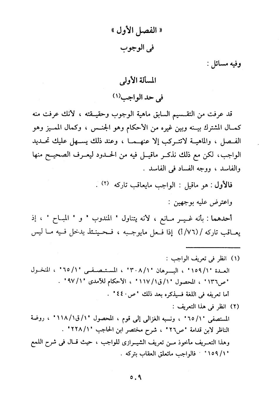 قد عرفت من التقسيم السابق ماهية الوجوب وحقيقته، لأنك عرفت منه كمال المشترك بينه وبين غيره من الأحكام وهو الجنس، وكمال المميز وهو الفصل، والماهية لا تتركب إلا عنهما، وعند ذلك يسهل عليك تحديد الواجب، لكن مع ذلك نذكر ما قيل فيه من الحدود ليعرف الصحيح منها والفاسد، ووجه الفساد في الفاسد.