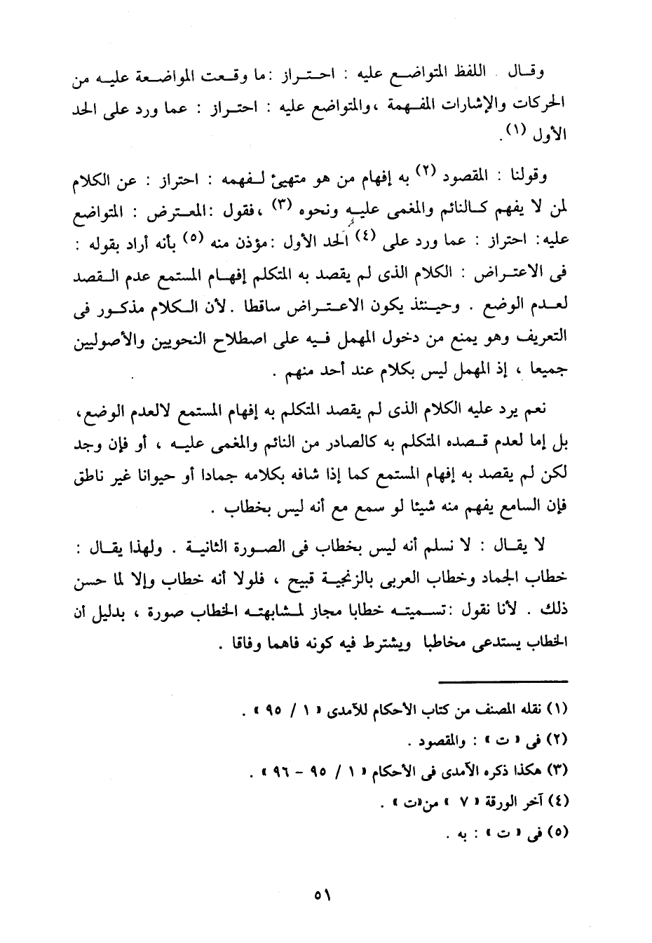 وقولنا: المقصود به إفهام من هو متهيئ لفهمه: احتراز: عن الكلام لمن لا يفهم كالنائم والمغمى عليه ونحوه، فقول: المعترض: المتواضع عليه: احتراز: عما ورد على الحد الأول: مؤذن منه بأنه أراد بقوله: في الاعتراض: الكلام الذي لم يقصد به المتكلم إفهام المستمع عدم القصد لعدم الوضع. وحينئذ يكون الاعتراض ساقطا. لأن الكلام مذكور في التعريف وهو يمنع من دخول المهمل فيه على اصطلاح النحويين والأصوليين جميعا، إذ المهمل ليس بكلام عند أحد منهم.