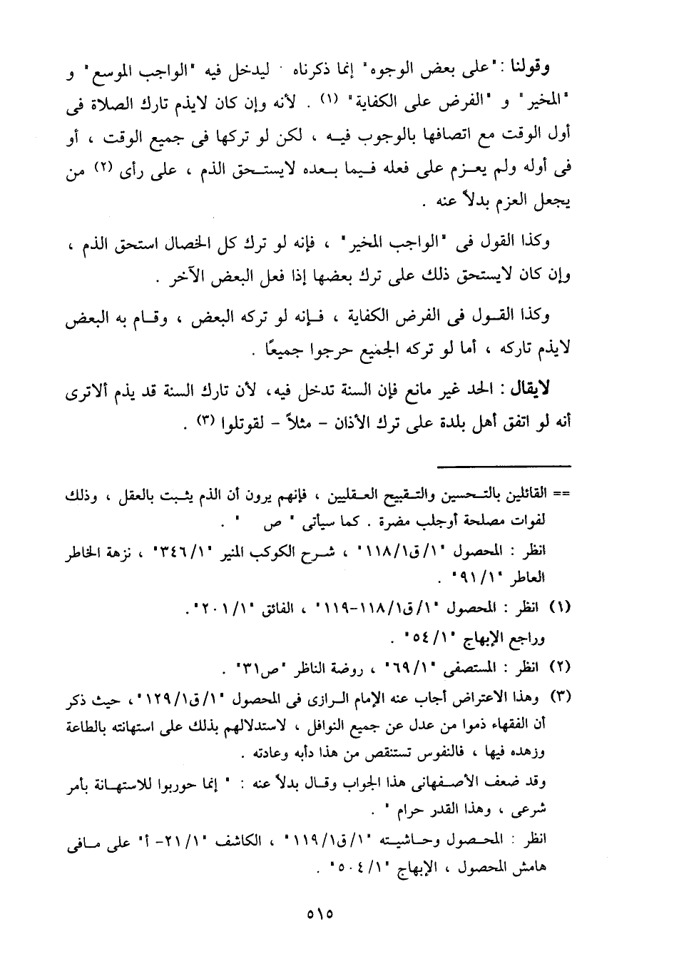 وقولنا: "على بعض الوجوه" إنما ذكرناه. ليدخل فيه "الواجب الموسع" و "المخير" و "الفرض على الكفاية". لأنه وإن كان لا يذم تارك الصلاة في أول الوقت مع اتصافها بالوجوب فيه، لكن لو تركها في جميع الوقت، أو في أوله ولم يعزم على فعله فيما بعده لا يستحق الذم، على رأي من يجعل العزم بدلا عنه.