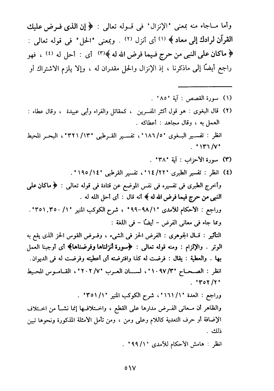 وأما ما جاء منه بمعنى "الإنزال" في قوله تعالى: {إن الذي فرض غليك القرآن لرادك إلى معاد} أي أنزل. وبمعنى "الحل" في قوله تعالى: {ما كان على النبي من حرج فيما فرض الله له} أي: أحل له، فهو راجع أيضا إلى ما ذكرنا، إذ الإنزال والحل مقدران له، وإلا يلزم الاشتراك أو