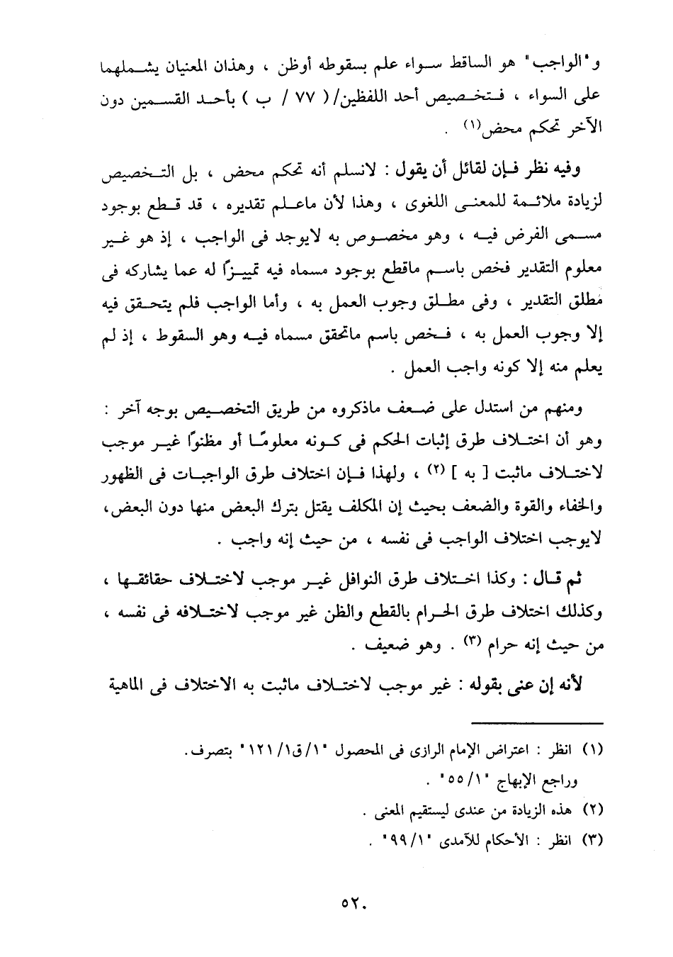 ومنهم من استدل على ضعف ما ذكروه من طريق التخصيص بوجه آخر: وهو أن اختلاف طرق إثبات الحكم في كونه معلوما أو مظنوا غير موجب لاختلاف ما ثبت [به]، ولهذا فإن اختلاف طرق الواجبات في الظهور والخفاء والقوة والضعف بحيث إن المكلف يقتل بترك البعض منها دون البعض، لا يوجب اختلاف الواجب في نفسه، من حيث إنه واجب.