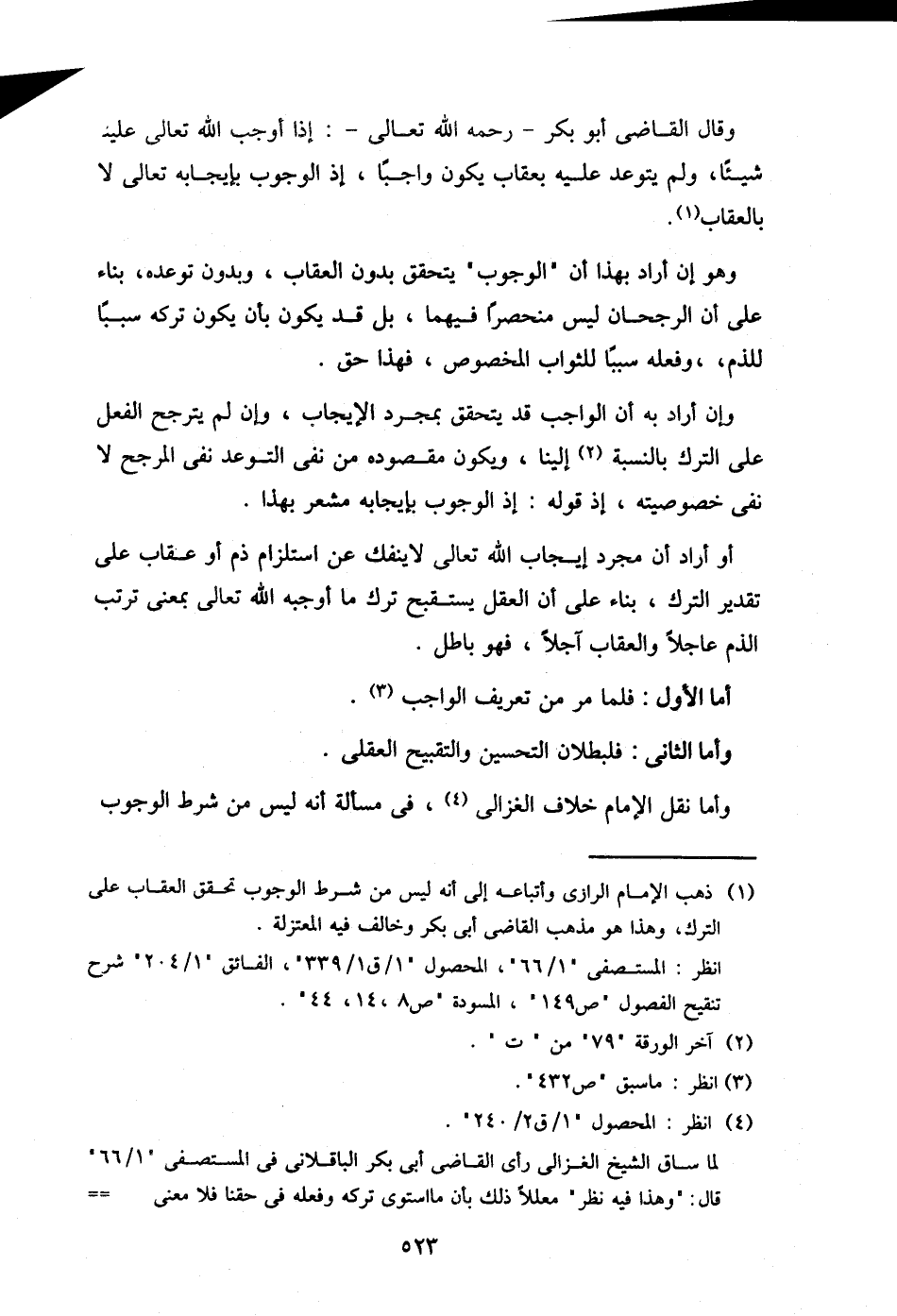 وقال القاضي أبو بكر- رحمه الله تعالى-: إذا أوجب الله تعالى علينا شيئا، ولم يتوعد عليه بعقاب يكون واجبا، إذ الوجوب بإيجابه تعالى لا بالعقاب.