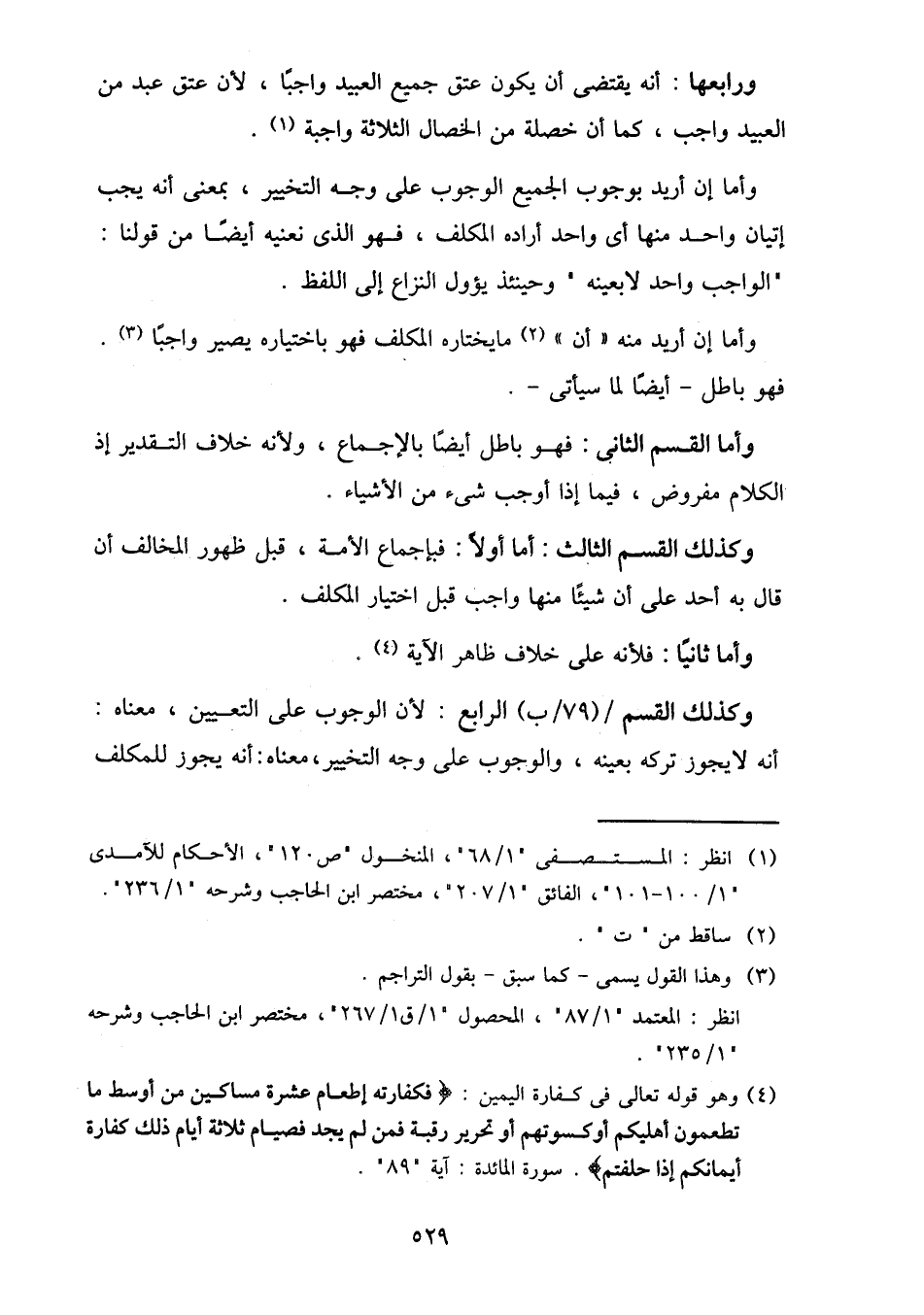 ورابعها: أنه يقتضي أن يكون عتق جميع العبيد واجبا، لأن عتق عبد من العبيد واجب، كما أن خصلة من الخصال الثلاثة واجبة.