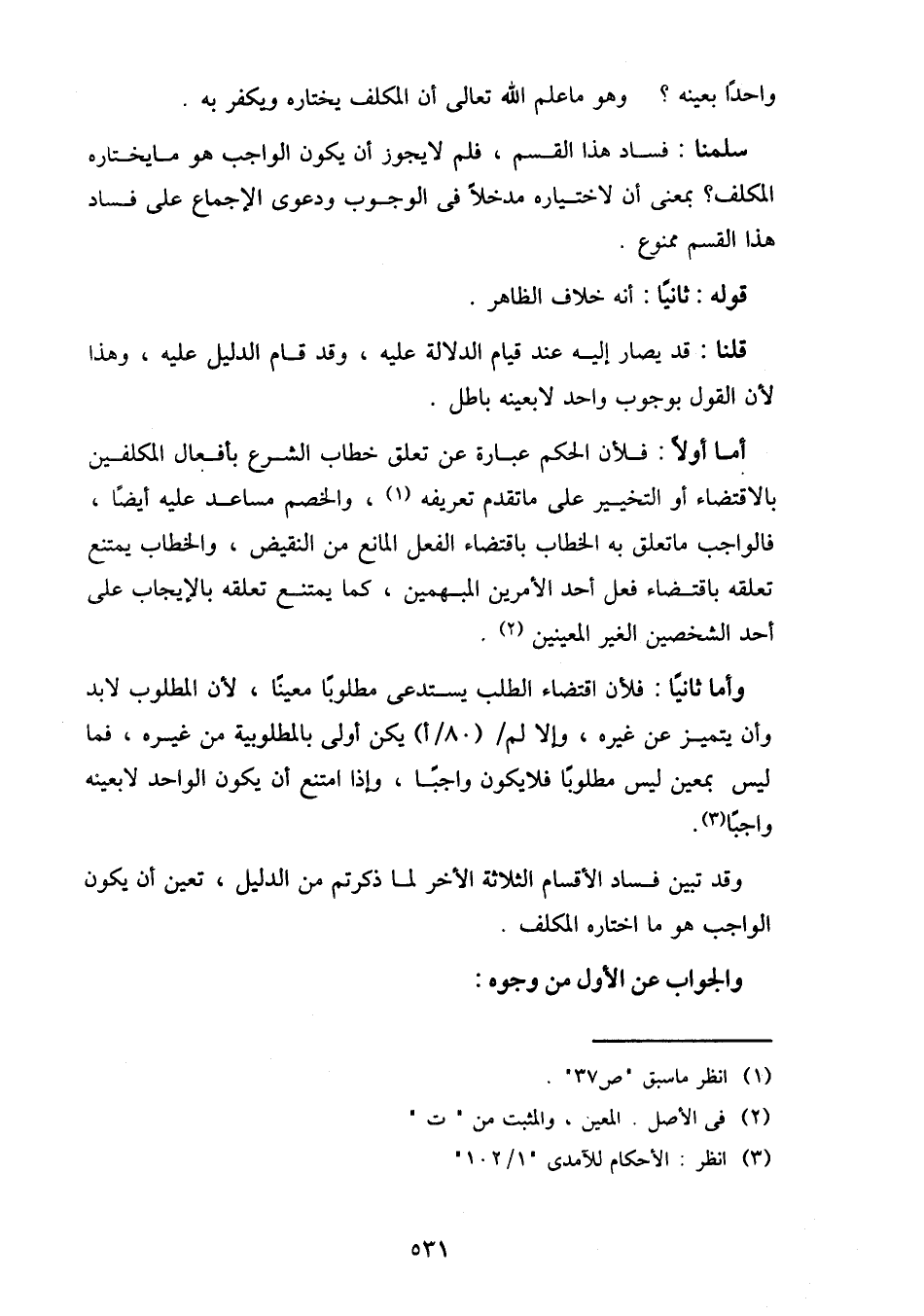 أما أولا: فلأن الحكم عبارة عن تعلق خطاب الشرع بأفعال المكلفين بالاقتضاء أو التخيير على ما تقدم تعريفه، والخصم مساعد عليه أيضا، فالواجب ما تعلق به الخطاب باقتضاء الفعل المانع من النقيض، والخطاب يمتنع تعلقه باقتضاء فعل أحد الأمرين المبهمين، كما يمتنع تعلقه بالإيجاب على أحد الشخصين الغير المعينين.