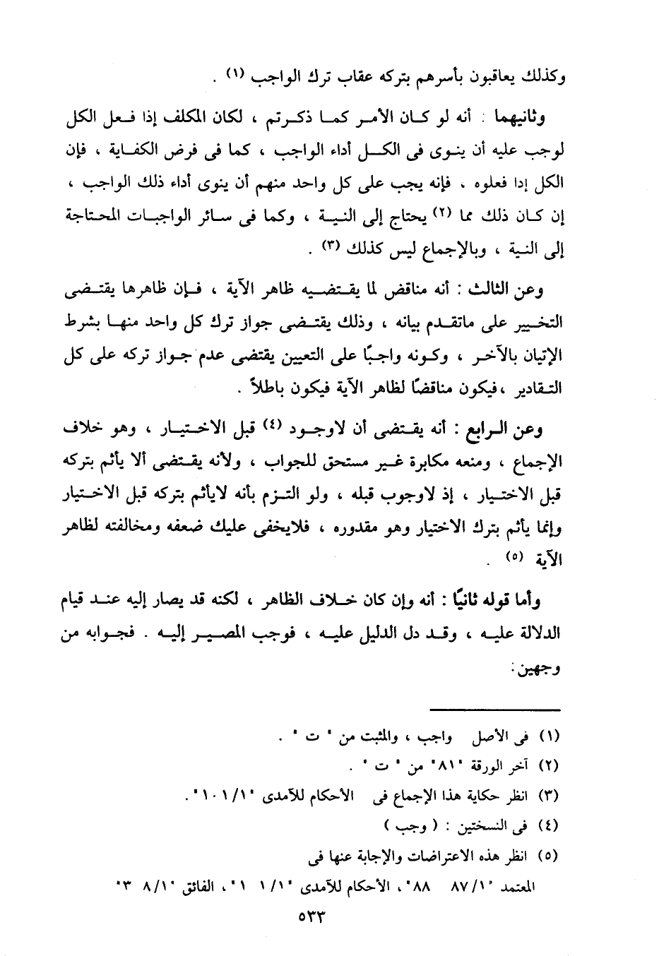 وثانيها: أنه لو كان الأمر كما ذكرتم، لكان المكلف إذا فعل الكل لوجب عليه أن ينوي في الكل أداء الواجب، كما في فرض الكفاية، فإن الكل إذا فعلوه، فإنه يجب على كل واحد منهم أن ينوي أداء ذلك الواجب، إن كان ذلك مما يحتاج إلي النية، وكما في سائر الواجبات المحتاجة إلى النية، وبالإجماع ليس كذلك.