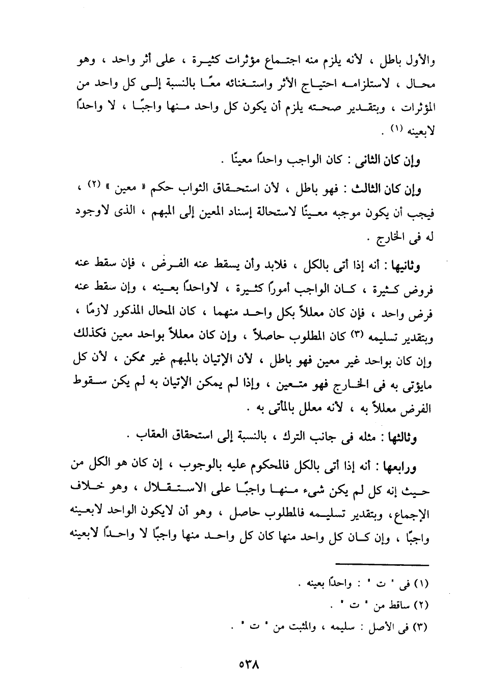 وثانيها: أنه إذا أتى بالكل، فلابد وان يسقط عنه الفرض، فإن سقط عنه فروض كثيرة، كان الواجب أمورا كثيرة، لا واحدا بعينه، وإن سقط عنه فرض واحد، فإن كان معللا بكل واحد منهما، كان المحال المذكور لازما، وبتقدير تسليمه كان المطلوب حاصلا، وإن كان معللا بواحد معين فكذلك وإن كان بواحد غير معين فهو باطل، لأن الإتيان بالمبهم غير ممكن، لأن كل ما يؤتى به في الخارج فهو متعين، وإذا لم يمكن الإتيان به لم يكن سقوط الفرض معللا به، لأنه معلل بالماتي به.