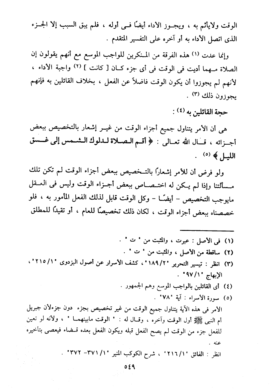 ولو فرض أن للأمر إشعارا بالتخصيص ببعض أجزاء الوقت لم تكن تلك مسألتنا وإذا لم يكن له اختصاص ببعض أجزاء الوقت وليس في العقل ما يوجب التخصيص- أيضا- وكل الوقت قابل لذلك الفعل المأمور به، فلو خصصناه ببعض أجزاء الوقت، لكان ذلك تخصيصا للعام، أو تقييداً للمطلق
