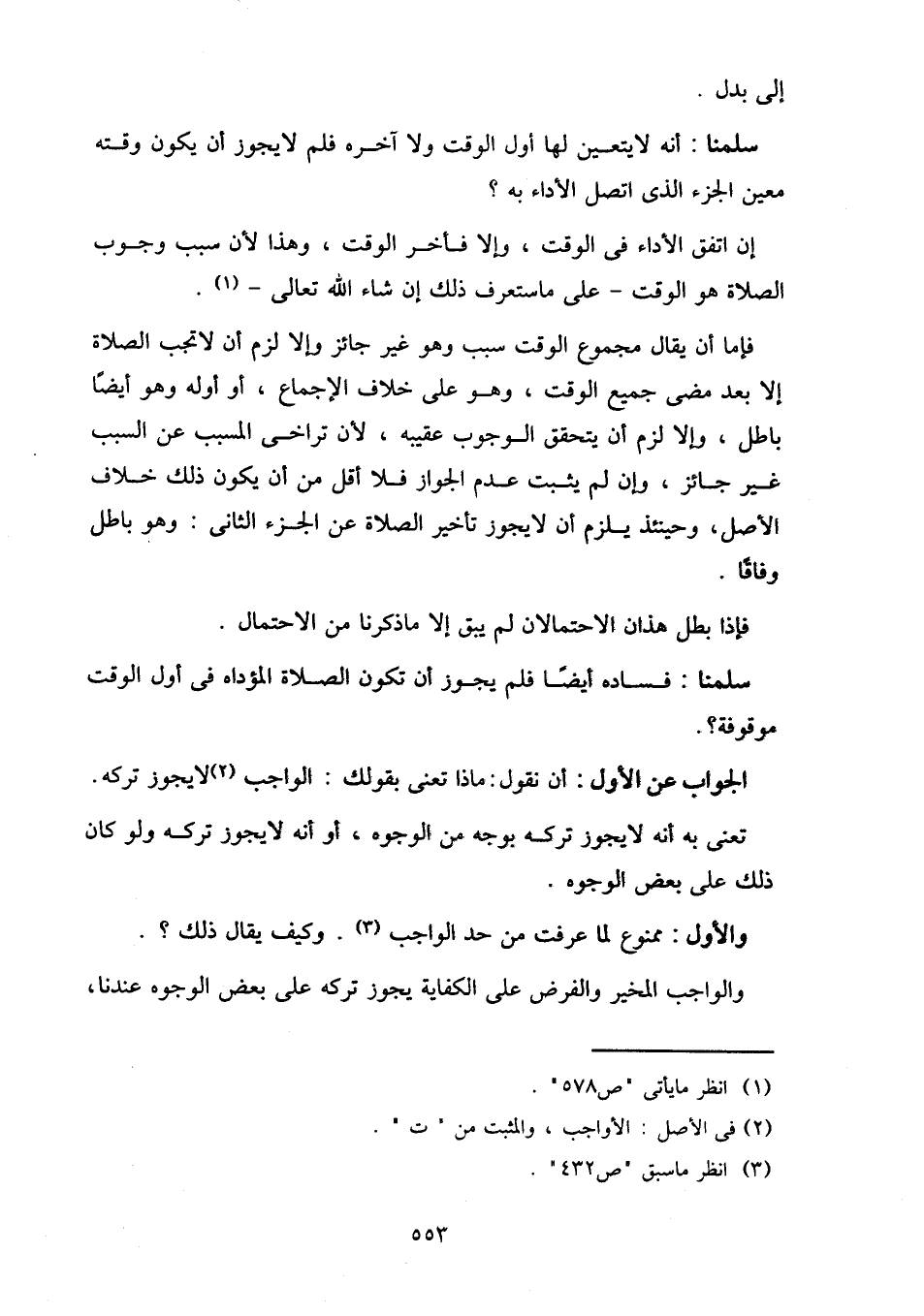 فأما أن يقال مجموع الوقت سبب وهو غير جائز وإلا لزم أن لا تجب الصلاة إلا بعد مضي جميع الوقت، وهو على خلاف الإجماع، أو أوله وهو أيضا باطل، وإلا لزم أن يتحقق الوجوب عقيبه، لأن تراخي المسبب عن السبب غير جائز، وإن لم يثبت عدم الجواز فلا أقل من أن يكون ذلك خلاف الأصل، وحينئذ يلزم أن لا يجوز تأخير الصلاة عن الجزء الثاني: وهو باطل وفاقا.