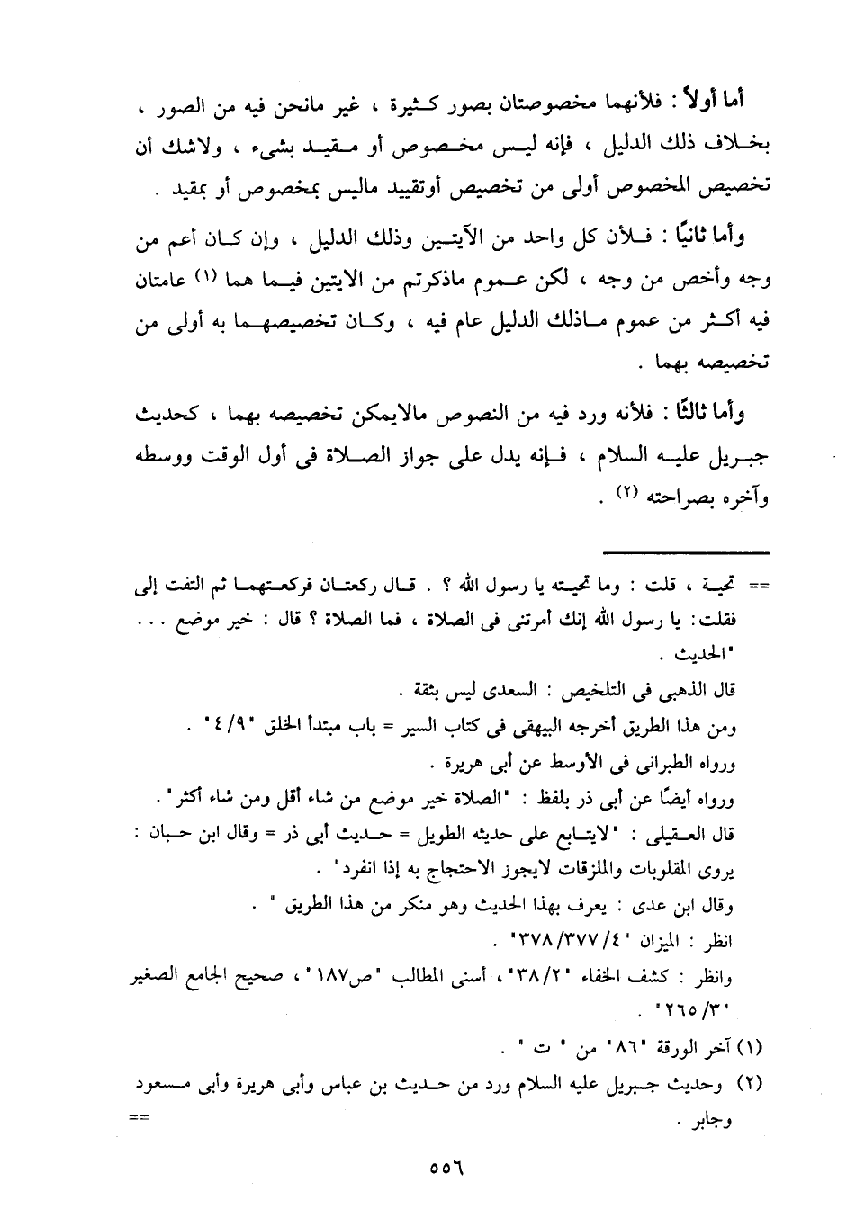 وأما ثالثا: فلأنه ورد فيه من النصوص ما لا يمكن تخصيصه بهما، كحديث جبريل عليه السلام، فإنه يدل على جواز الصلاة في أول الوقت ووسطه وآخره بصراحته.