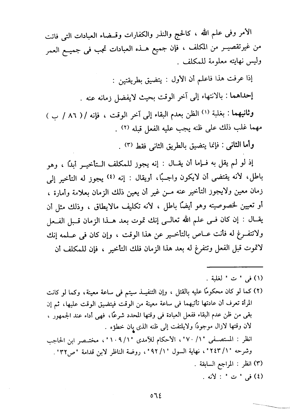 إذ لو لم يقل به فإما أن يقال: إنه يجوز للمكلف التأخير أبدا، وهو باطل، لأنه يقتضي أن لا يكون واجبا، أو يقال: إنه يجوز له التأخير إلى زمان معين ولا يجوز التأخير عنه من غير أن يعين ذلك الزمان بعلامة وأمارة، أو تعيين لخصوصيته وهو أيضا باطل، لأنه تكليف ما لا يطاق، وذلك مثل أن يقال: إن كان في علم الله تعالى إنك تموت بعد هذا الزمان قبل الفعل ولا تتفرغ له فأنت عاص بالتأخير عن هذا الوقت، وإن كان في علمه إنك لا تموت قبل الفعل وتتفرغ له بعد هذا الزمان فلك التأخير، فإن للمكلف أن