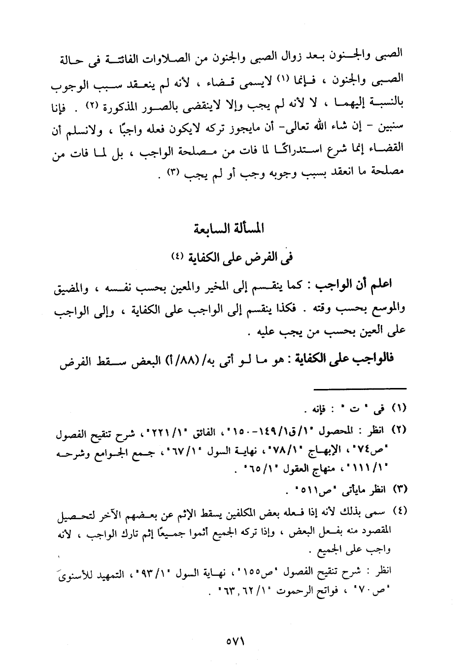 الصبي والمجنون بعد زوال الصبى والجنون من الصلاوات الفائتة في حالة الصبى والجنون، فإنما لا يسمى قضاء، لأنه لم ينعقد سبب الوجوب بالنسبة إليهما، لا لأنه لم يجب وإلا لا ينقضي بالصور المذكورة. فإنا سنبين- إن شاء الله تعالى- أن ما يجوز تركه لا يكون فعله واجبا، ولا نسلم أن القضاء إنما شرع استدراكا لما فات من مصلحة الواجب، بل لما فات من مصلحة ما انعقد بسبب وجوبه وجب أو لم يجب.