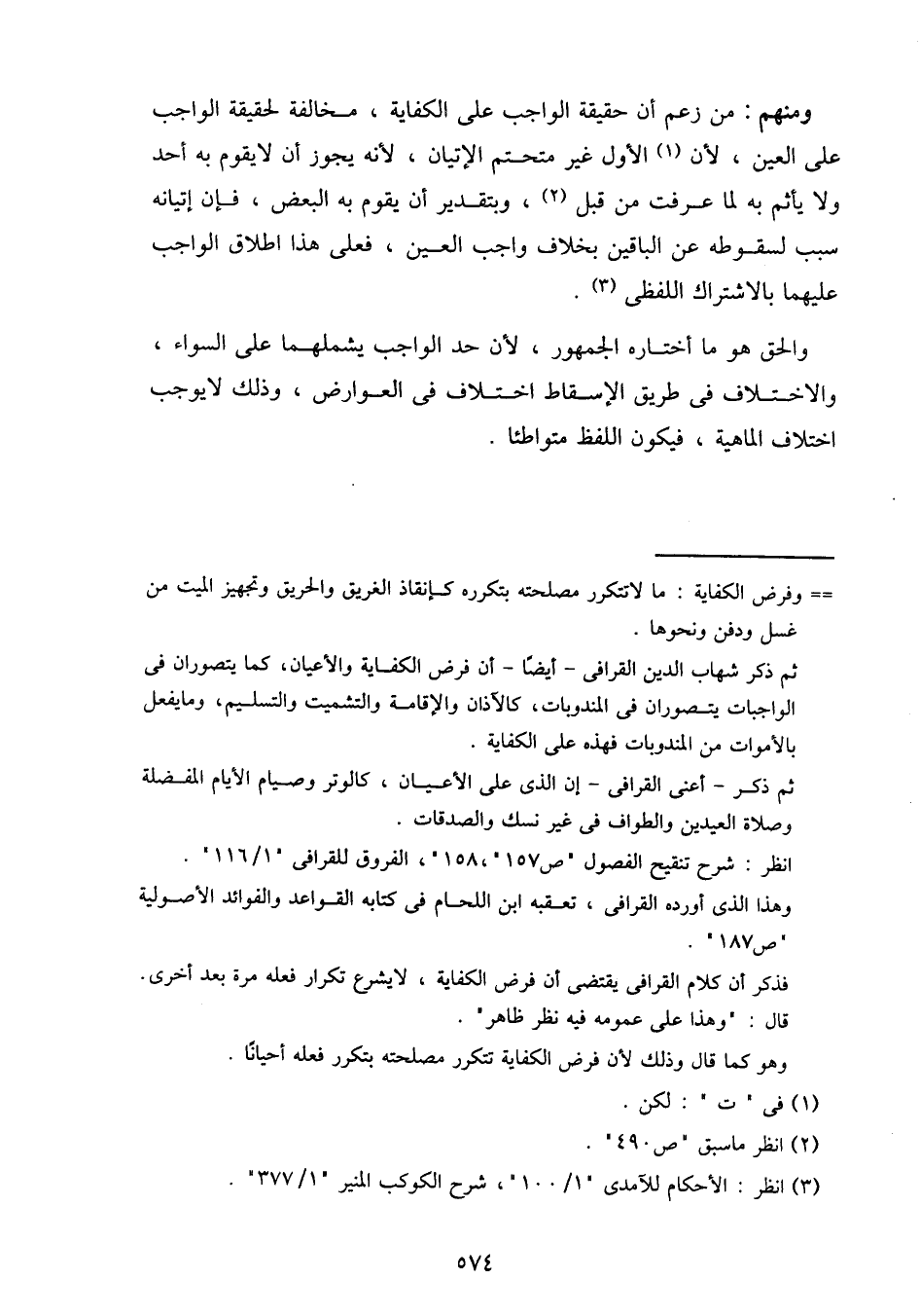 ومنهم: من زعم أن حقيقة الواجب على الكفاية، مخالفة لحقيقة الواجب على العين، لأن الأول غير متحتم الإتيان، لأنه يجوز أن لا يقوم به أحد ولا يأثم به لما عرفت من قبل، وبتقدير أن يقوم به البعض، فإن إتيانه سبب لسقوطه عن الباقين بخلاف واجب العين، فعلى هذا إطلاق الواجب عليهما بالاشتراك اللفظي.