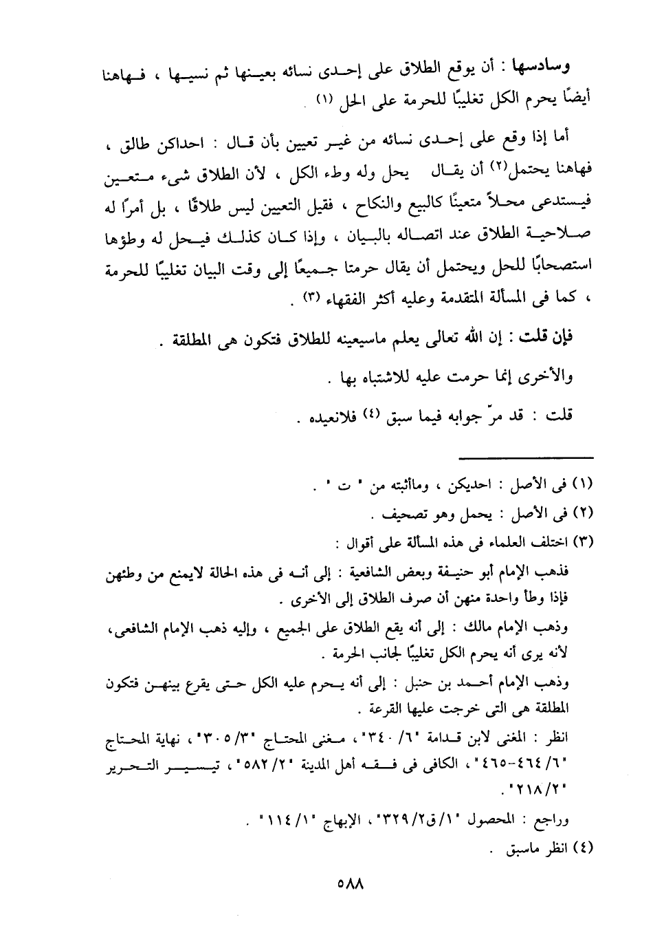 أما إذا وقع على إحدى نسائه من غير تعيين بأن قال: احداكن طالق، فهاهنا يحتمل أن يقال يحل وله وطء الكل، لأن الطلاق شيء متعين فيستدعي محلا متعينا كالبيع والنكاح، فقيل التعيين ليس طلاقا، بل أمرا له صلاحية الطلاق عند اتصاله بالبيان، وإذا كان كذلك فيحل له وطؤها استصحابا للحل ويحتمل أن يقال حرمتا جميعا إلى وقت البيان تغليبا للحرمة، كما في المسألة المتقدمة وعليه أكثر الفقهاء.