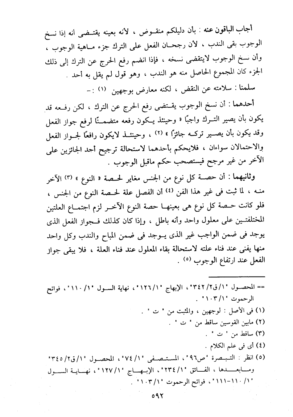 وثانيهما: أن حصة كل نوع من الجنس مغاير لحصة "النوع" الآخر منه، لما ثبت في غير هذا الفن أن الفصل علة لحصة النوع من الجنس، فلو كانت حصة كل نوع هي بعينها حصة النوع الآخر لزم اجتماع العلتين المختلفين على معلول واحد وأنه باطل، وإذا كان كذلك فجواز الفعل الذي يوجد في ضمن الواجب غير الذي يوجد في ضمن المباح والندب وكل واحد منها يفنى عند فناء علته لاستحالة بقاء المعلول عند فناء العلة، فلا يبقى جواز الفعل عند ارتفاع الوجوب.