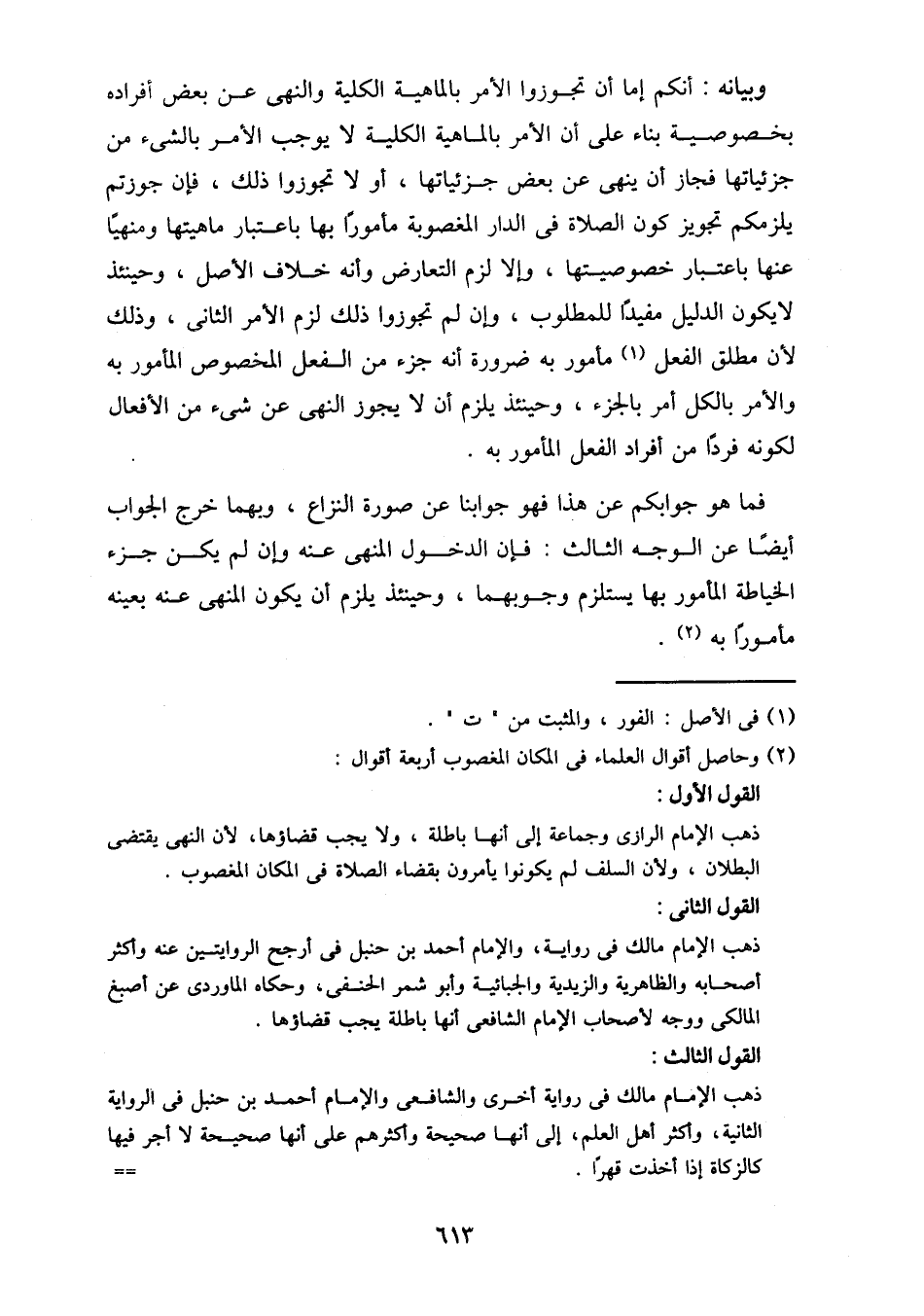 وبيانه: أنكم إما أن تجوزوا الأمر الماهية الكلية والنهي عن بعض أفراده بخصوصية بناء على أن الأمر بالماهية الكلية لا يوجب الأمر بالشيء من جزئياتها فجاز أن ينهى عن بعض جزئياتها، أو لا تجوزوا ذلك، فإن جوزتم يلزمكم تجويز كون الصلاة في الدار المغصوبة مأمورا بها باعتبار ماهيتها ومنهيا عنها باعتبار خصوصيتها، وإلا لزم التعارض وأنه خلاف الأصل، وحينئذ لا يكون الدليل مفيدا للمطلوب، وإن لم تجوزوا ذلك لزم الأمر الثاني، وذلك لأن مطلق الفعل مأمور به ضرورة أنه جزء من الفعل المخصوص المأمور به والأمر بالكل أمر بالجزء، وحينئذ يلزم أن لا يجوز النهي عن شيء من الأفعال لكونه فردا من أفراد الفعل المأمور به.