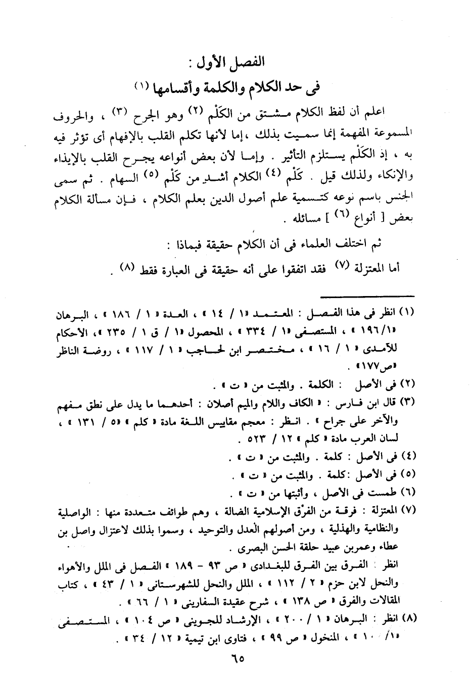 اعلم أن لفظ الكلام مشتق من الكلم وهو الجرح، والحروف المسموعة المفهمة إنما سميت بذلك، إما لأنها تكلم القلب بالإفهام أي توثر فيه به، إذ الكلام يستلزم التأثير. وإما لأن بعض أنواعه يجرح القلب بالإيذاء والإنكاء ولذلك قيل. كلم الكلام أشد من كلم السهام. ثم سمي الجنس باسم نوعه كتسمية علم أصول الدين بعلم الكلام، فإن مسألة الكلام بعض [أنواع] مسائله.