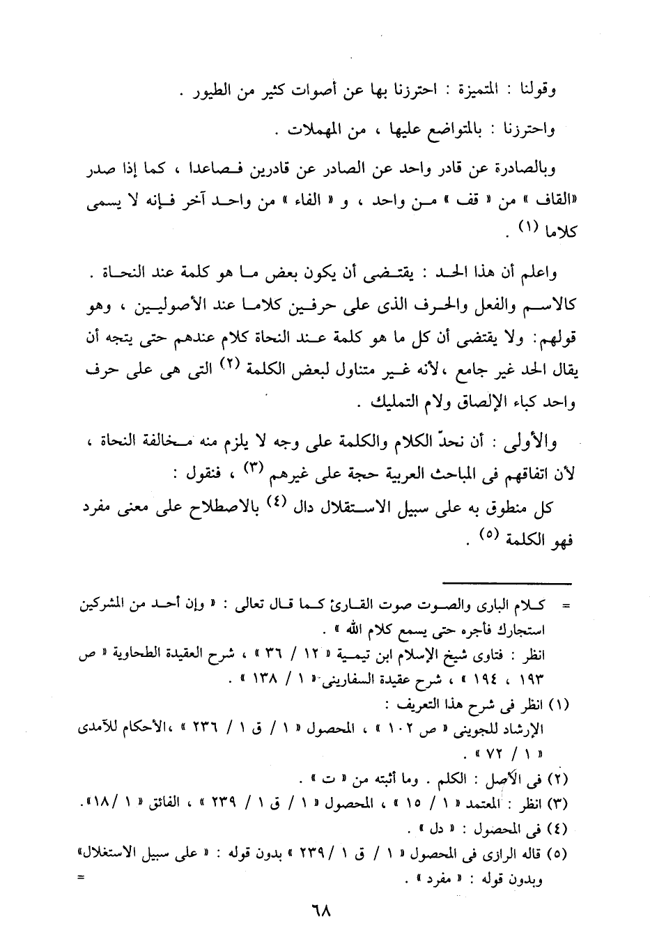 والأولى: أن نحد الكلام والكلمة على وجه لا يلزم منه مخالفة النحاة، لأن اتفاقهم في المباحث العربية حجة على غيرهم، فيقول: