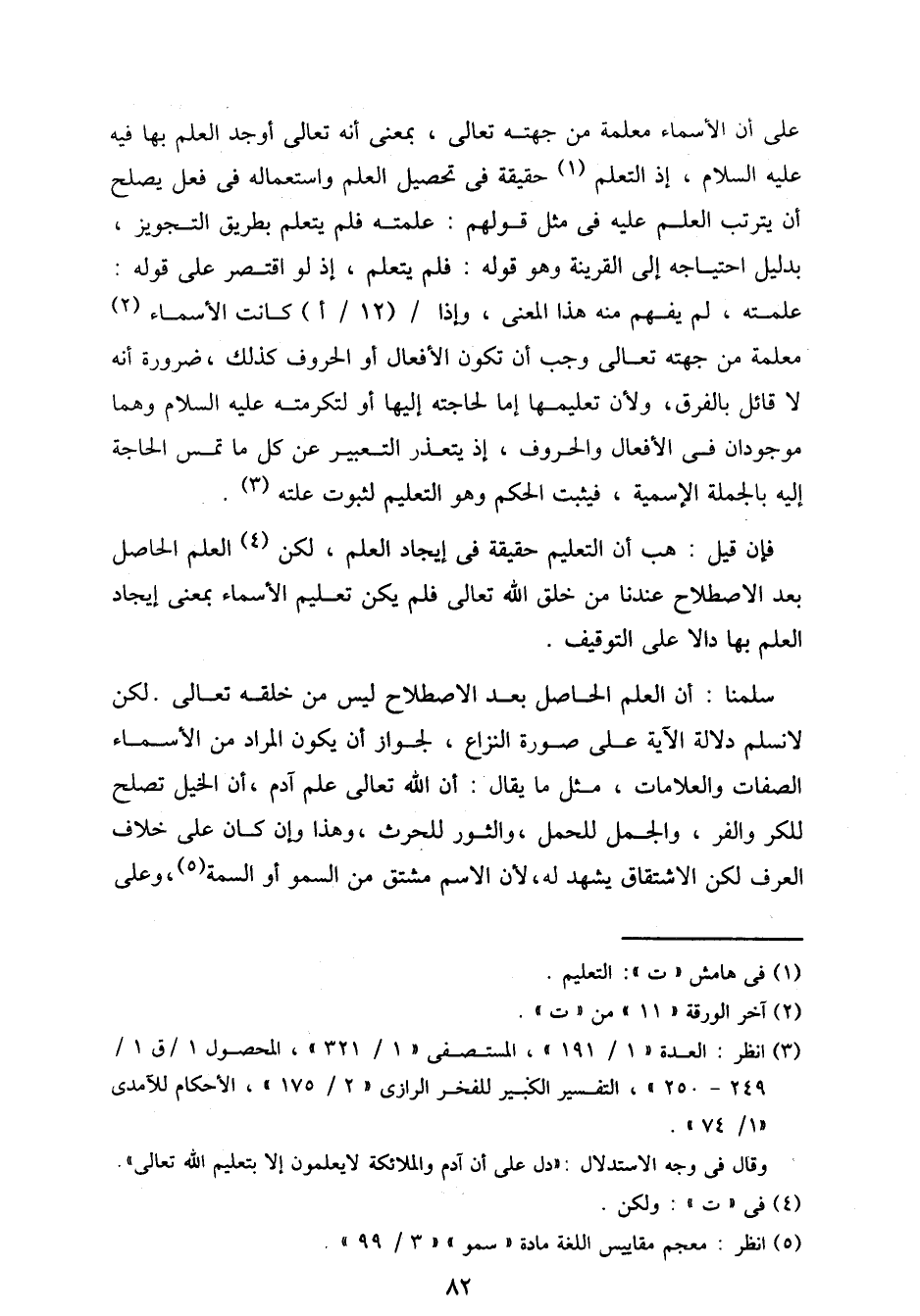 على أن الأسماء معلمة من جهته تعالى، بمعنى أنه تعالى اوجد العلم بها فيه عليه السلام، إذ التعلم حقيقة في تحصيل العلم واستعماله في فعل يصلح أن يترتب العلم عليه في مثل قولهم: علمته فلم يتعلم بطريق التجويز، بدليل احتياجه إلى القرينة وهو قوله: فلم يتعلم، إذ لو اقتصر على قوله: علمته، لم يفهم منه هذا المعنى، وإذا / (12/أ) كانت الأسماء معلمة من جهته تعالى وجب أن تكون الأفعال أو الحروف كذلك، ضرورة أنه لا قائل بالفرق، ولأن تعليمها إما لحاجته إليها أو لتكرمته عليه السلام وهما موجودان في الأفعال والحروف، إذ يتعذر التعبير عن كل ما تمس الحاجة إليه بالجملة الإسمية، فيثبت الحكم وهو التعليم لثبوت علته.