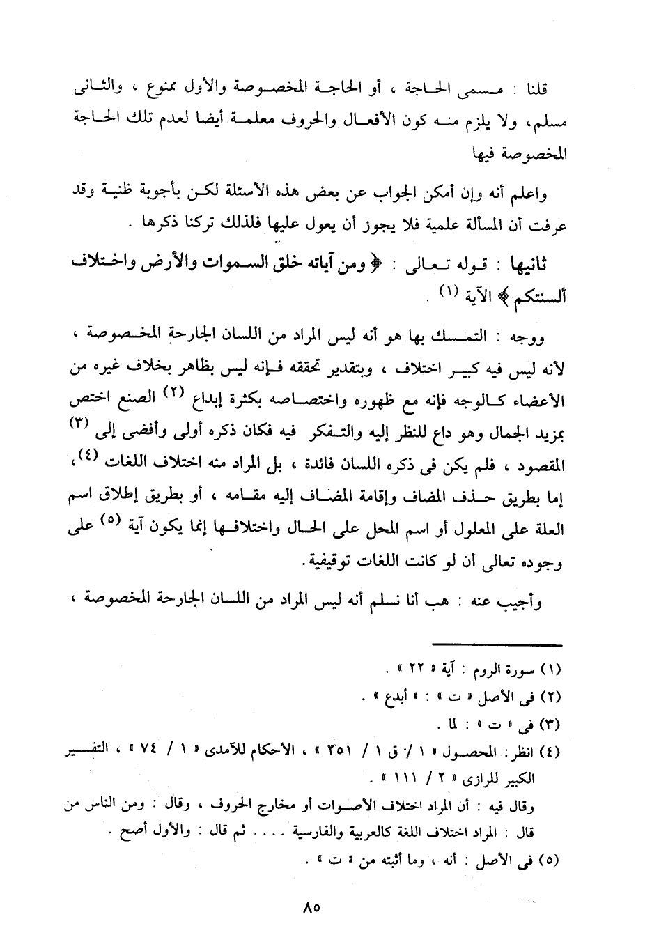 ووجه: التمسك بها هو أنه ليس المراد من اللسان الجارحة المخصوصة، لأنه ليس فيه كبير اختلاف، وبتقدير تحققه فإنه ليس بظاهر بخلاف غيره من الأعضاء كالوجه فإنه مع ظهوره واختصاصه بكثرة إبداع الصنع اختص بمزيد الجمال وهو داع للنظر إليه والتفكر فيه فكان ذكره أولى وأفضى إلى المقصود، فلم يكن في ذكره اللسان فائدة، بل المراد منه اختلاف اللغات، إما بطريق حذف المضاف وإقامة المضاف إليه مقامه، أو بطريق إطلاق اسم العلة على المعلول أو اسم المحل على الحال واختلافها إنما يكون آية على وجوده تعالى أن لو كانت اللغات توقيفية.