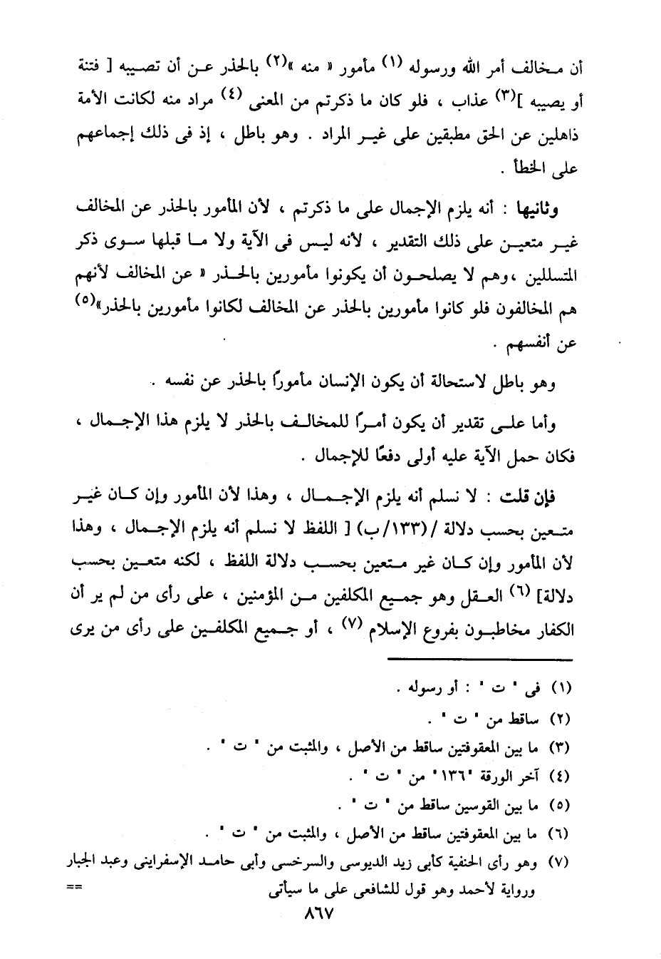 أن مخالف أمر الله ورسوله مأمور "منه" بالحذر عن أن تصيبه [فتنة أو يصيبه] عذاب، فلو كان ما ذكرتم من المعني مراد منه لكانت الأمة ذاهلين عن الحق مطبقين على غير المراد. وهو باطل، إذ في ذلك إجماعهم على الخطأ.